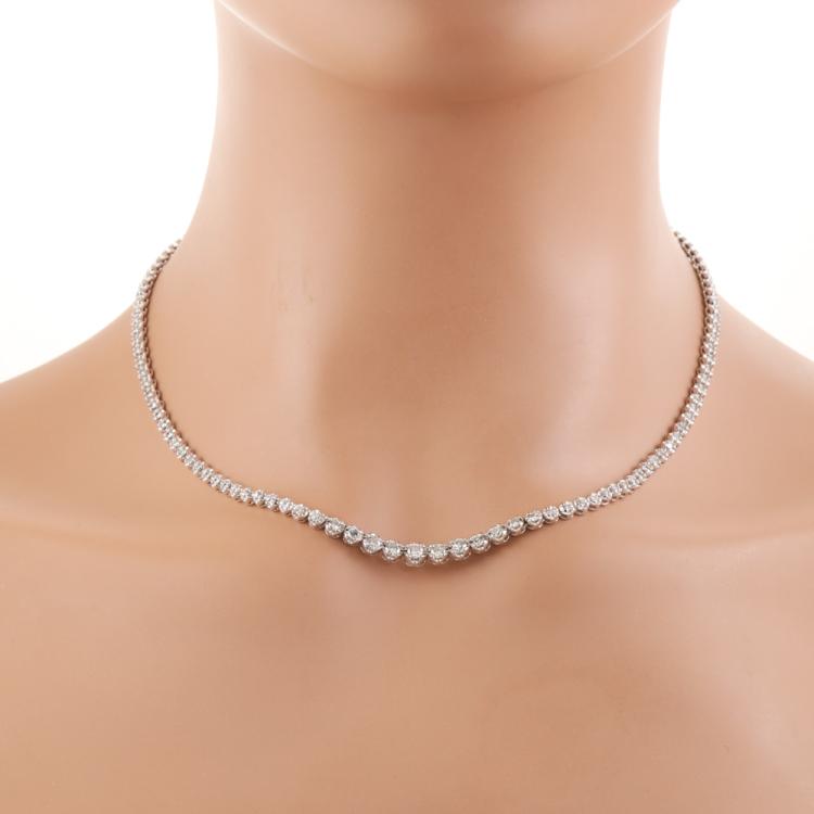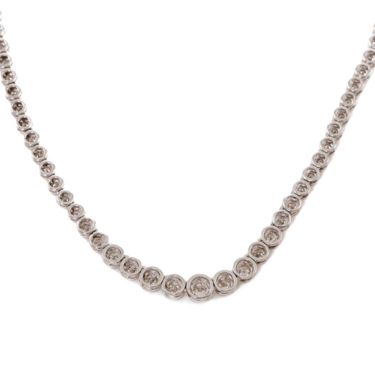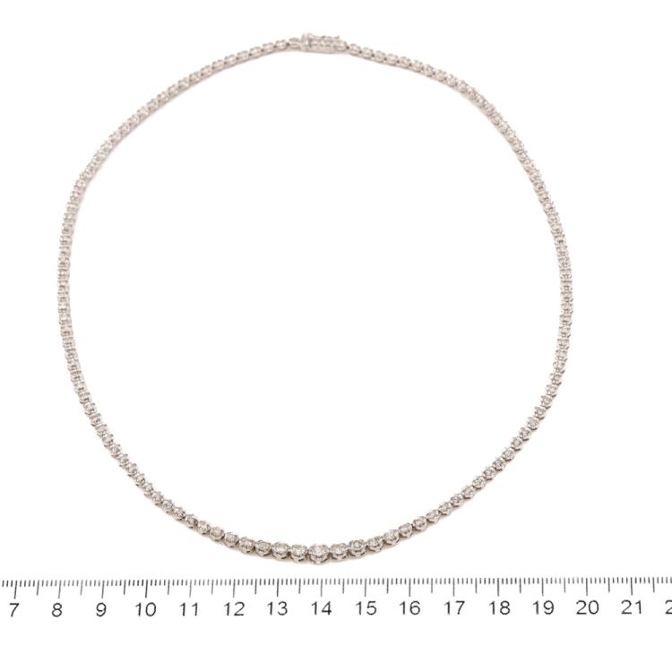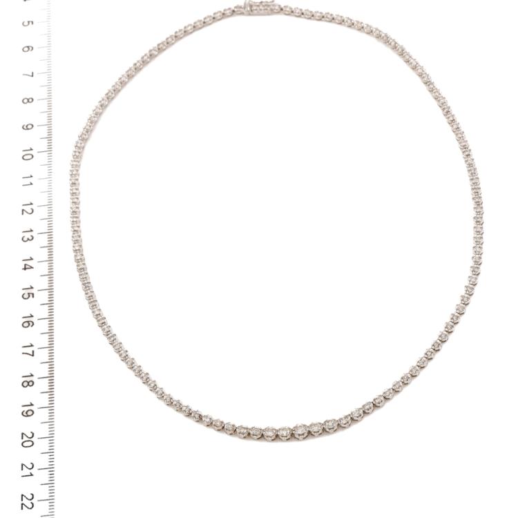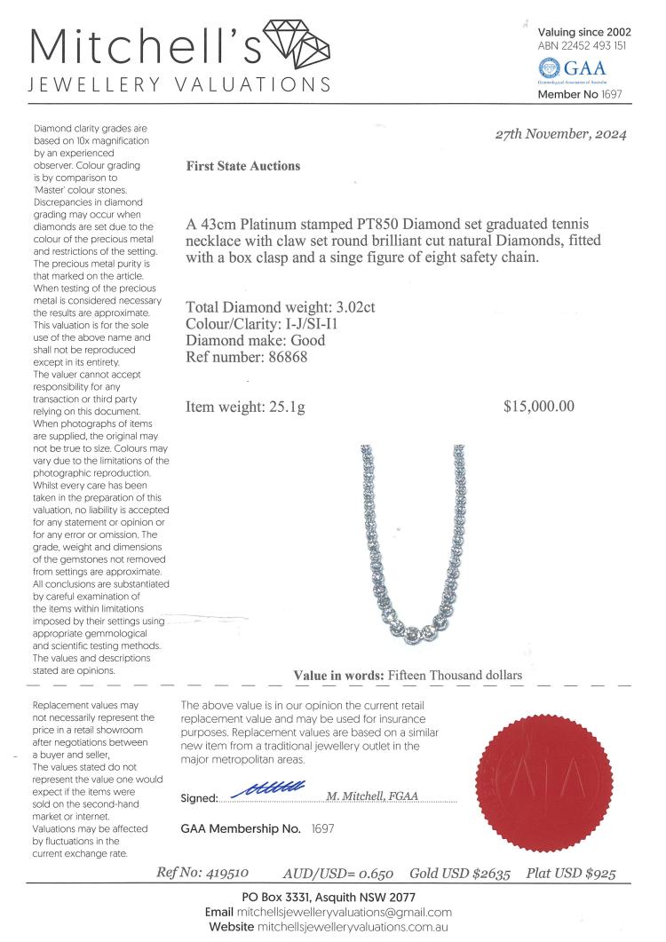Diamond tennis necklace with 123 graduated round Natural Diamonds totalling 3.02ct (Estimated grading: I-J SI-P1). Platinum - 850. Length: 43.0cm. Weight: 25.1g. With Valuation Certificate #419510. (Pre-owned)