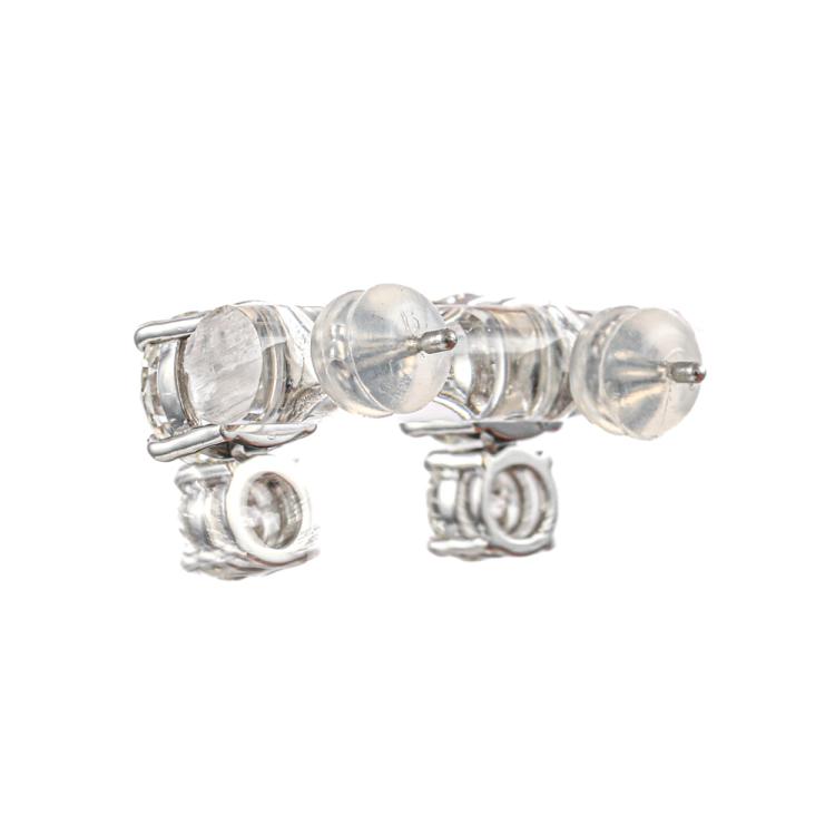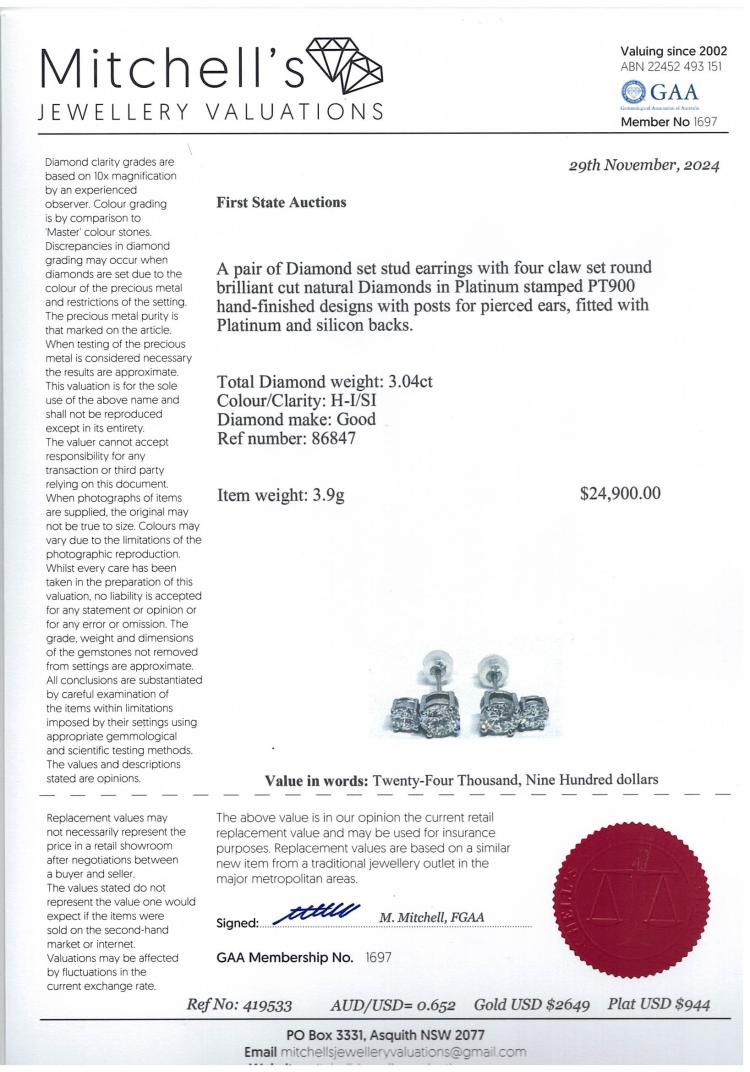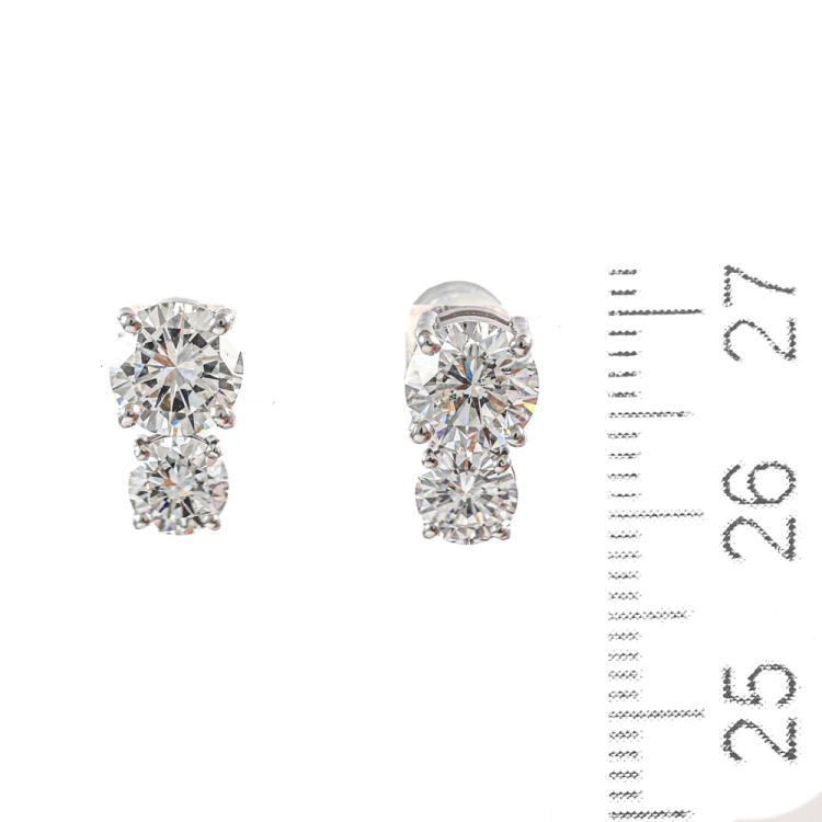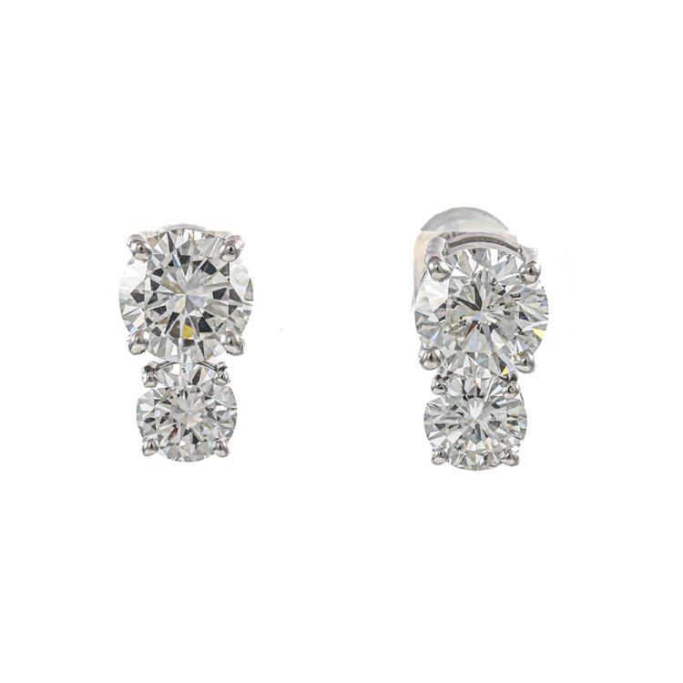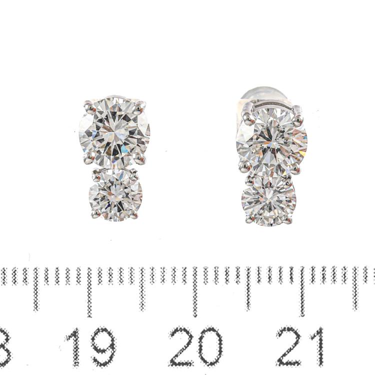 Diamond dress earrings with 4 round Natural Diamonds totalling 3.04ct (Estimated grading: H-I SI. Individual Diamond carat weight: 1.03ct. 1.08ct, 0.47ct & 0.46ct). Platinum - 900 with platinum - 900 & silicon backs. Weight: 3.9g. With Valuation Certificate #419533. (Pre-owned)