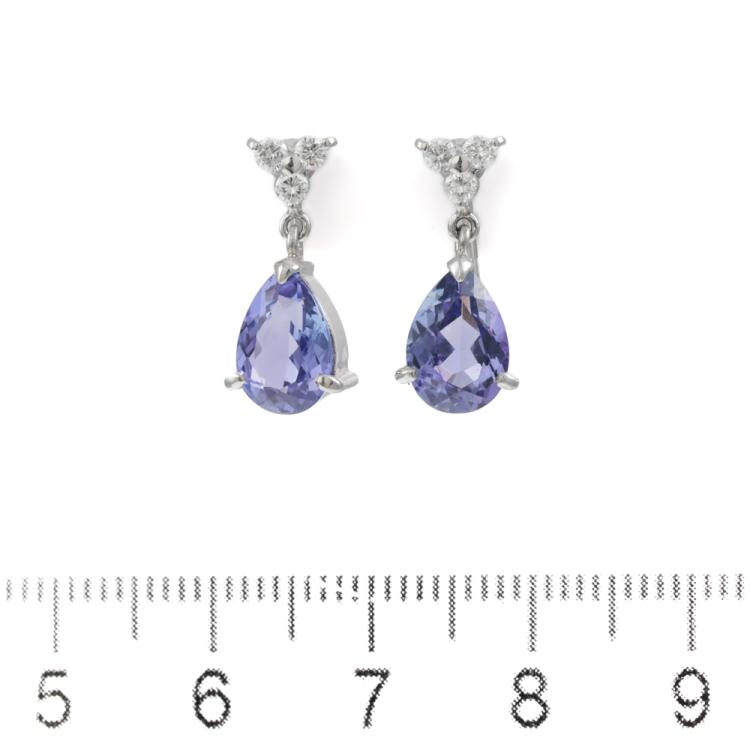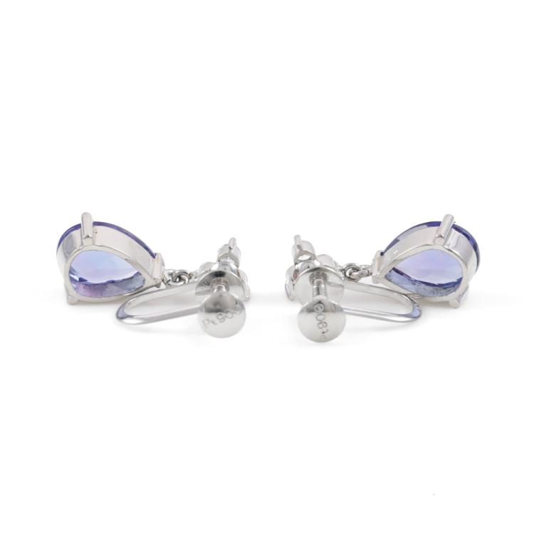 Tanzanite and Diamond clip-on screwback earrings (for non-pierced ears) with pear shape Natural Tanzanite totalling 3.13ct and round Natural Diamonds totalling 0.20ct. Platinum-900. Weight: 4.5g. (Pre-owned)