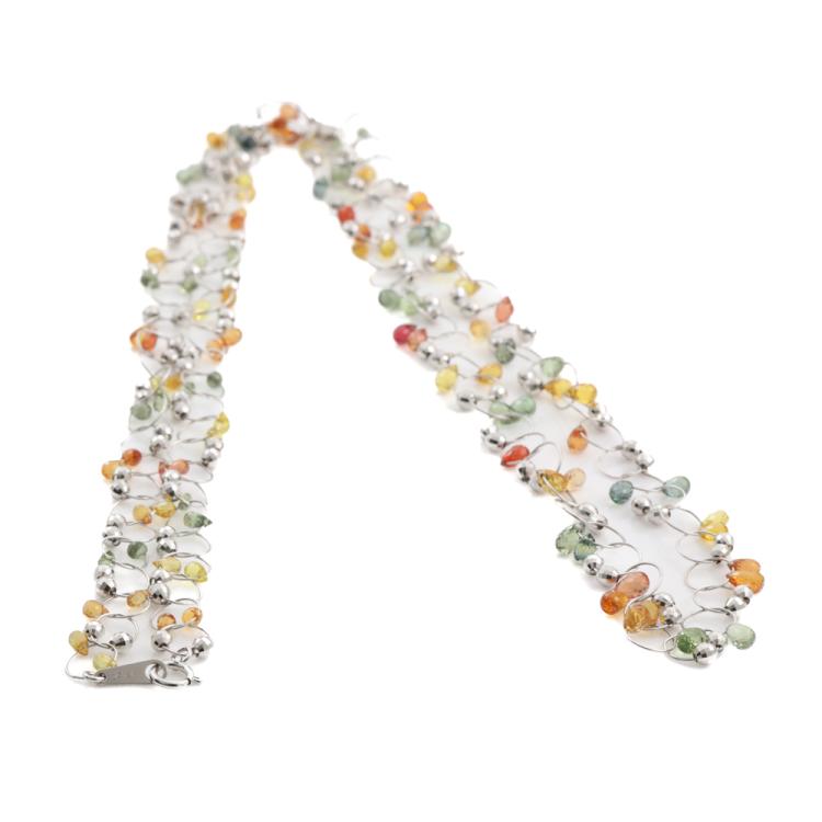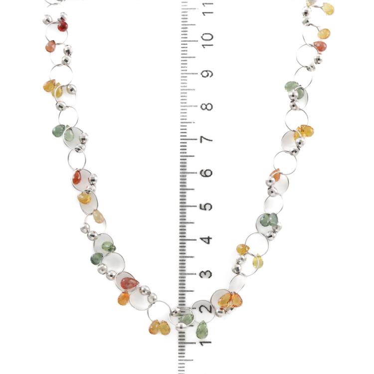 Sapphire necklace with multi colour Natural Sapphire briolette bead totalling 32.40ct. 18ct white gold. Length: 71cm. Weight: 17.3g. (Pre-owned)