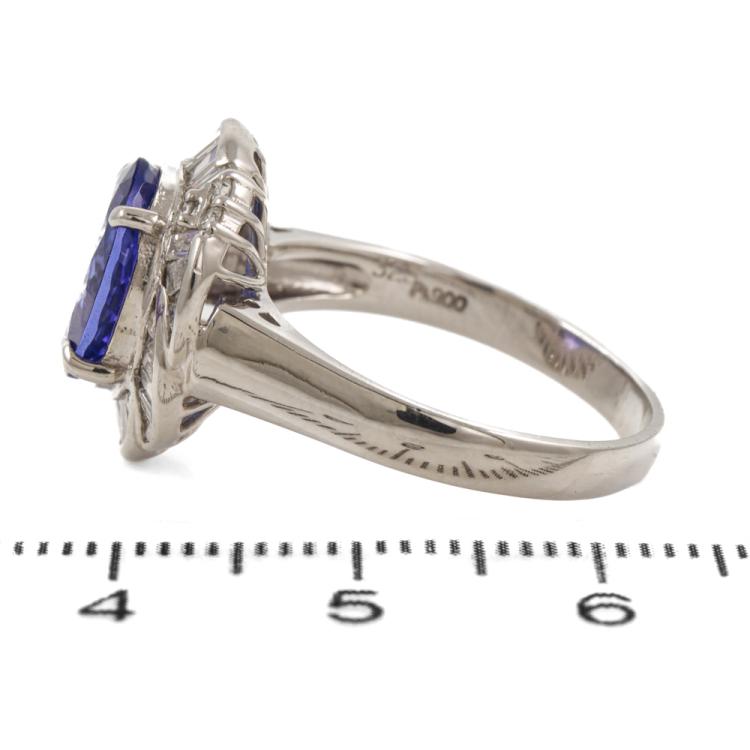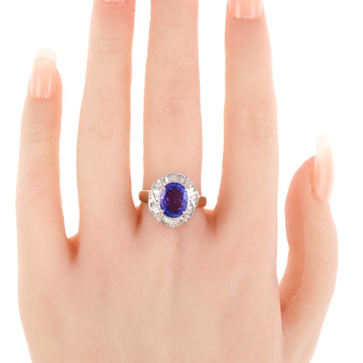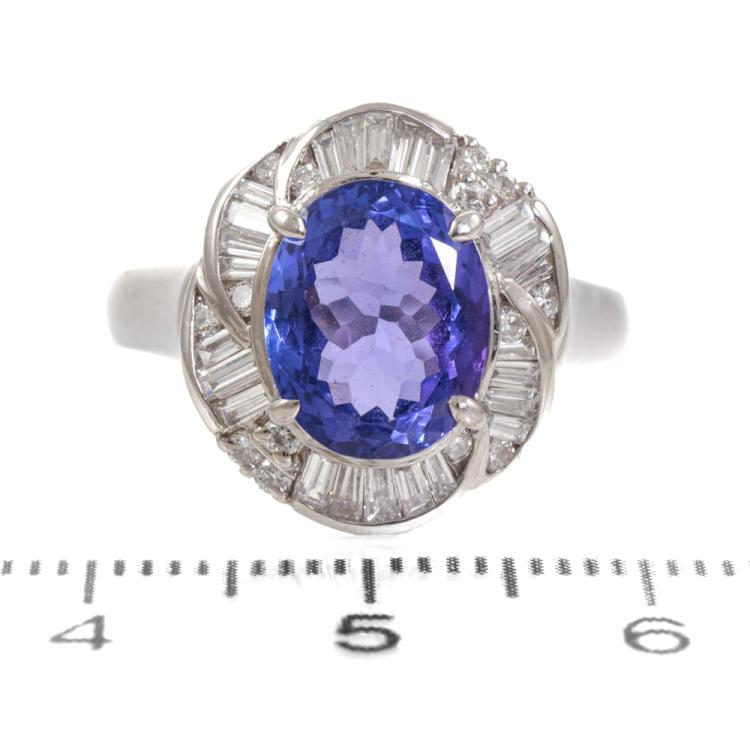 Tanzanite and Diamond ring with oval shape Natural Tanzanite of 3.25ct and round & baguette cut Natural Diamonds totalling 0.62ct (Estimated grading: H-I SI). Platinum - 900. Ring size: O1/2. Band width: 2.7mm - 3.1mm. Weight: 7.3g. (Pre-owned)