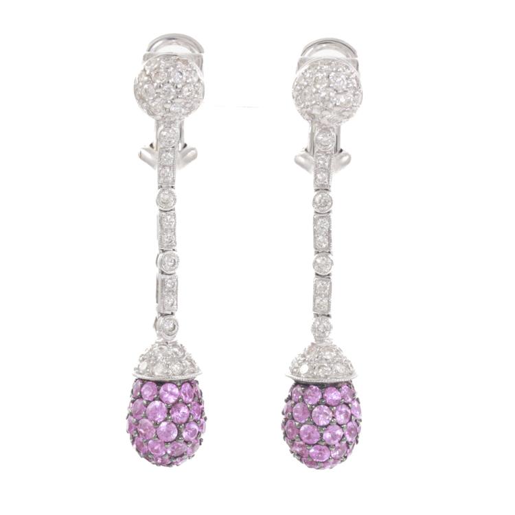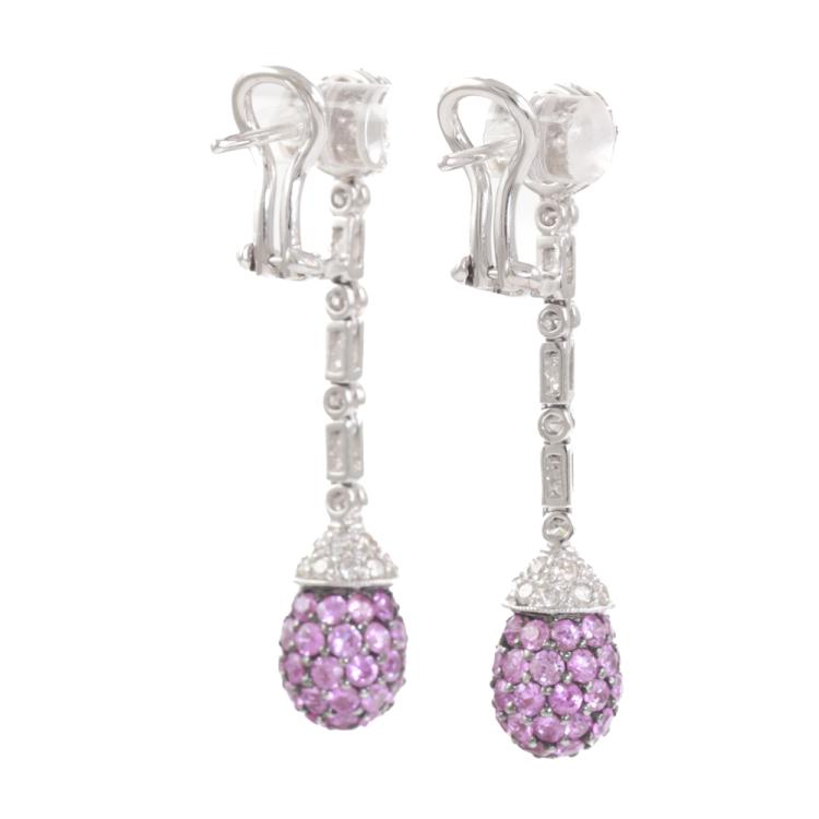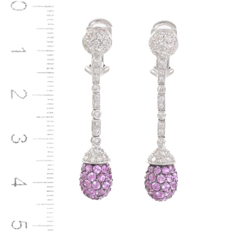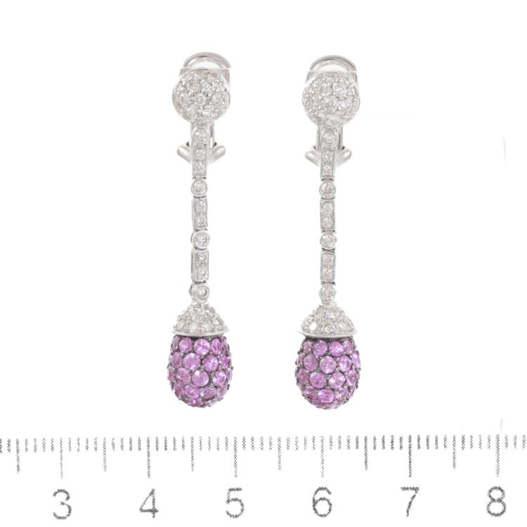 Sapphire and Diamond clip-on earrings (for pierced ears) with round pink natural Sapphires totalling 3.33ct and round natural Diamonds totalling 1.10ct (Estimated grading: I-J SI). 18ct white gold with black rhodium plating claws. Weight: 7.4g. (Pre-owned)