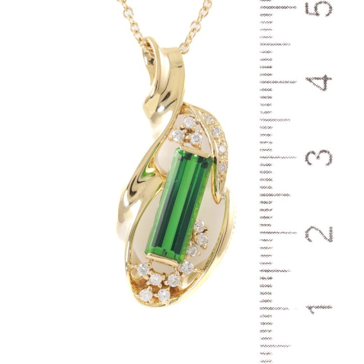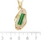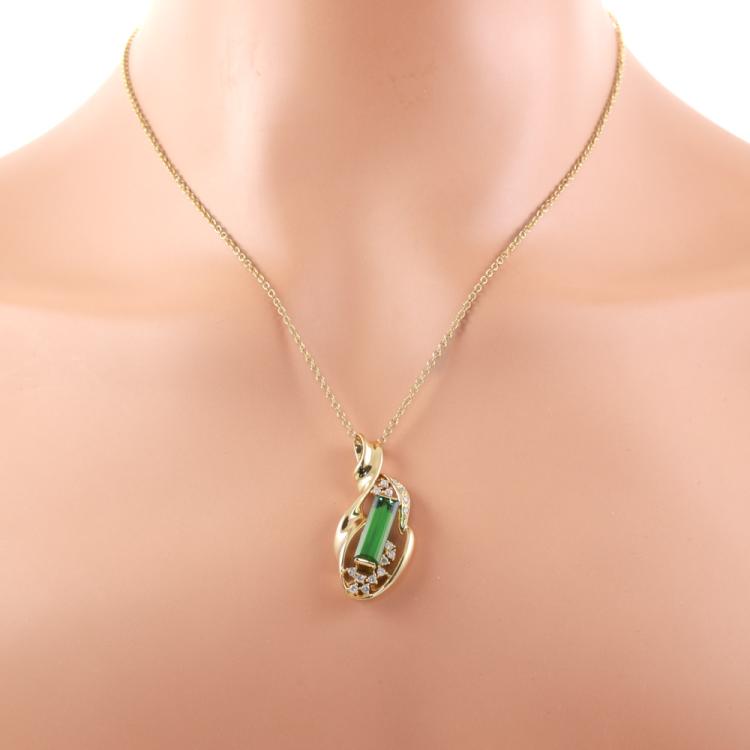 Tourmaline and Diamond pendant with centre baguette cut green Natural Tourmaline totalling approximately 3.38ct and round Natural Diamond totalling 0.26ct. 18ct yellow gold with 45.0cm 18ct yellow gold chain. Weight:
