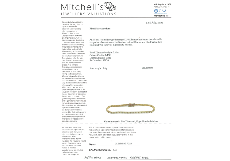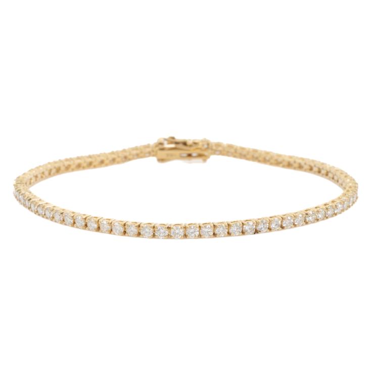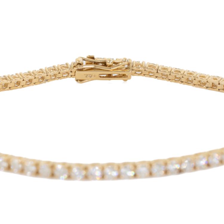 Diamond tennis bracelet with 69 round Natural Diamonds Totalling 3.41ct. (Estimated grading: J-K SI). 18ct yellow gold. Length: 18.0cm. Weight: 8.6g. With Valuation Certificate #418935 (New)