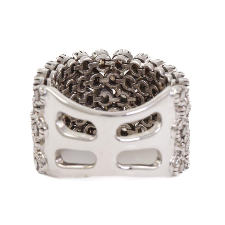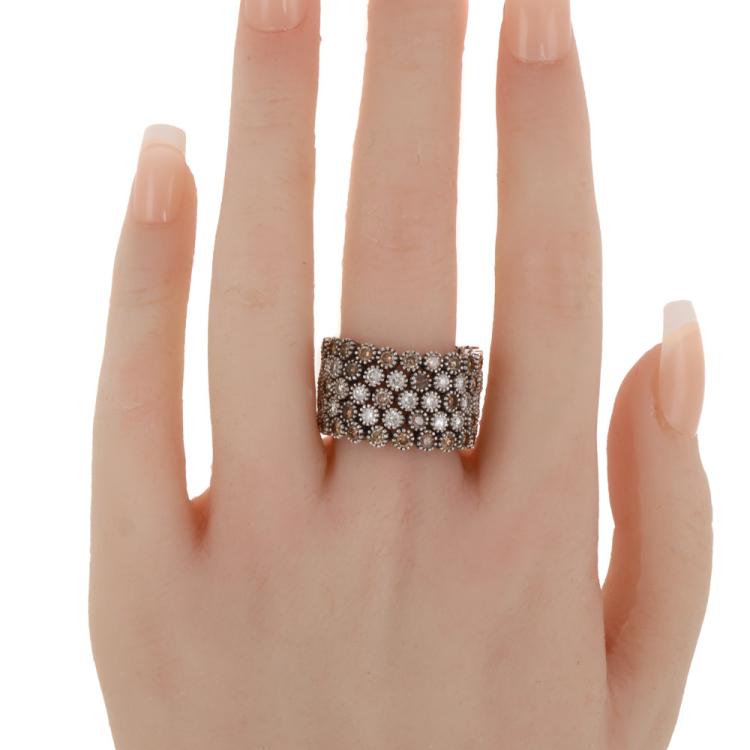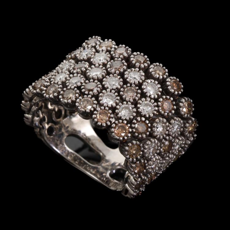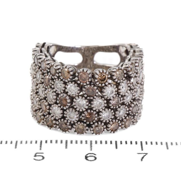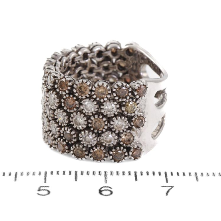 Diamond flexi ring with round white Natural Diamonds totalling 2.35ct (Estimated grading: H-I SI) and round fancy colour Natural Diamonds totalling 1.15ct (Estimated grading: Dark Champagne - Cognac SI-P1). 18ct white gold. Ring size O1/2. Minimum band width: 10.2mm. Weight: 15.9g. With Valuation Certificate #419342. (Pre-owned)
