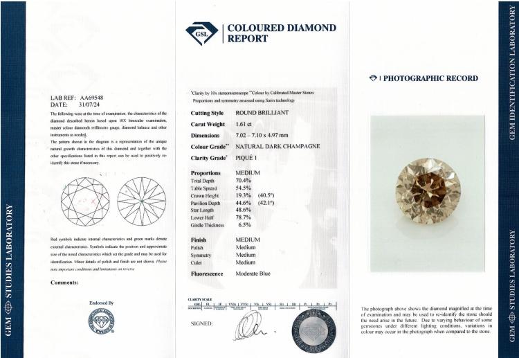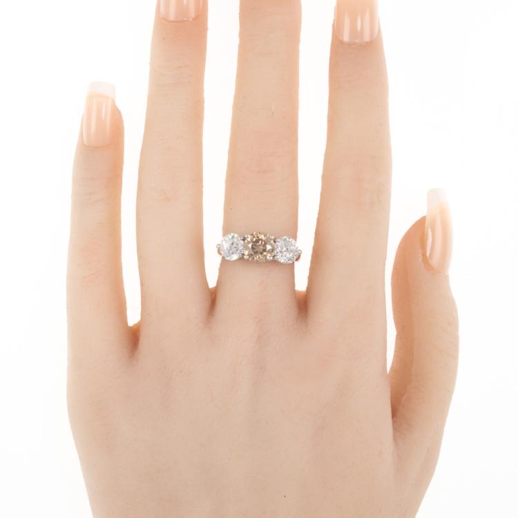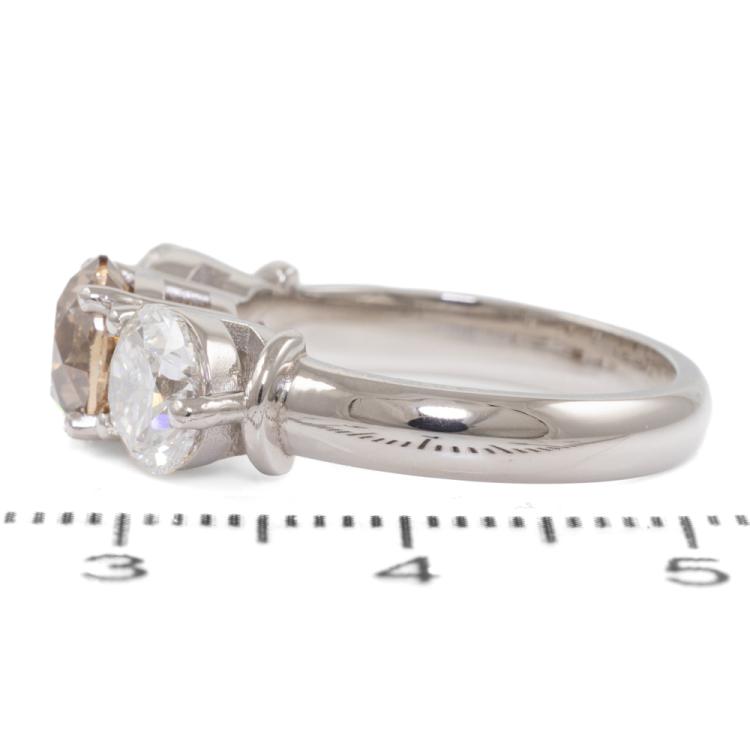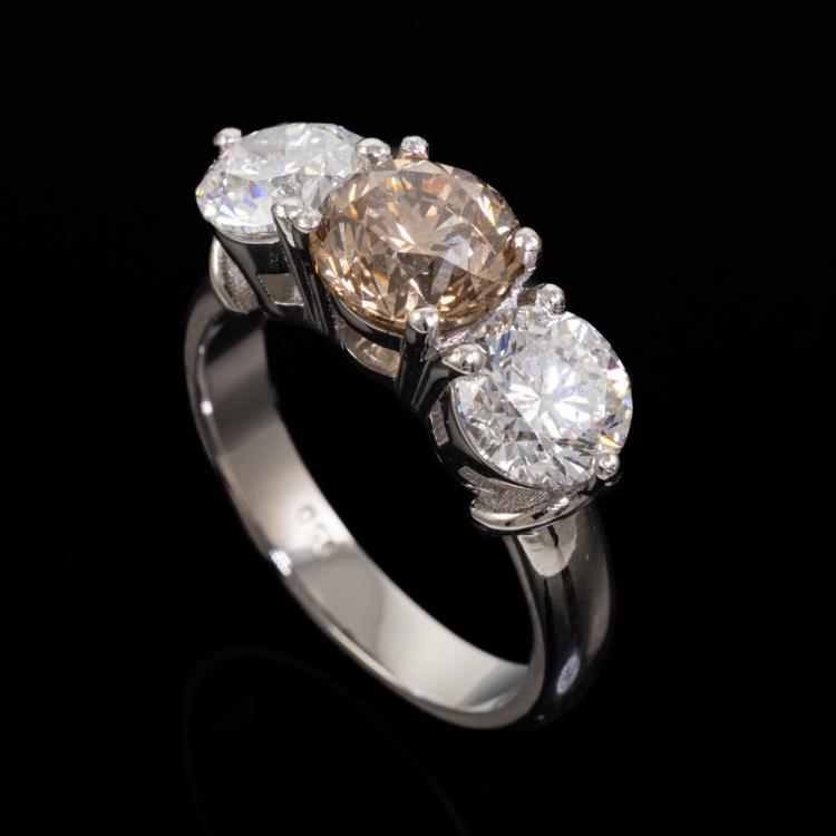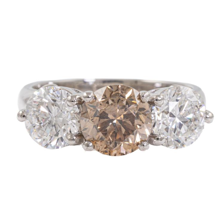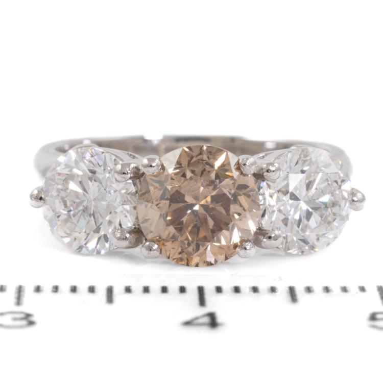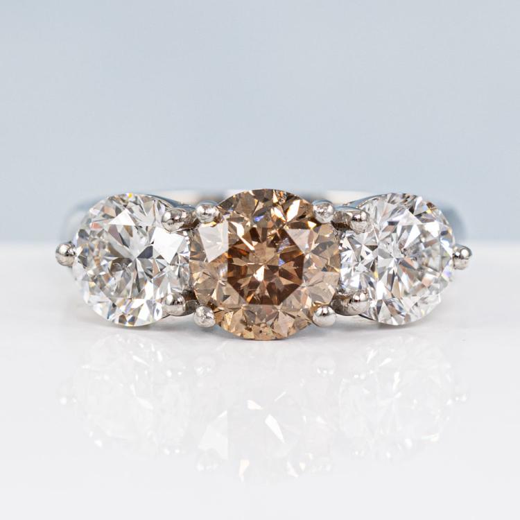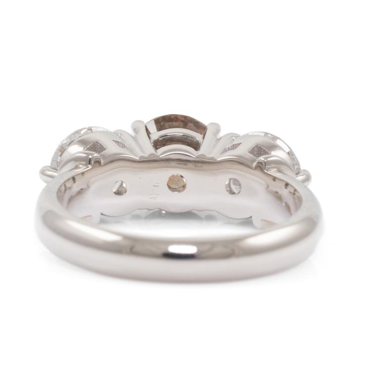 Diamond trilogy ring with centre round brilliant cut natural Diamond of 1.61ct (With GSL Report graded as Natural Dark Champagne P1 #AA69548) and 2 round brilliant cut natural Diamonds totalling 2.01ct (with GIA Reports graded as E P1 & F P1 #7403425511, 2414548414). Platinum - 950. Ring size L . Band width 3.11mm - 3.63mm. Weight 8.8g. (New)