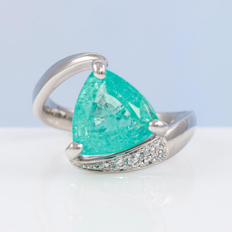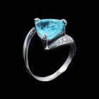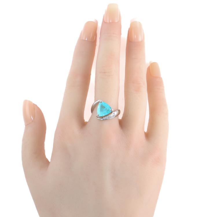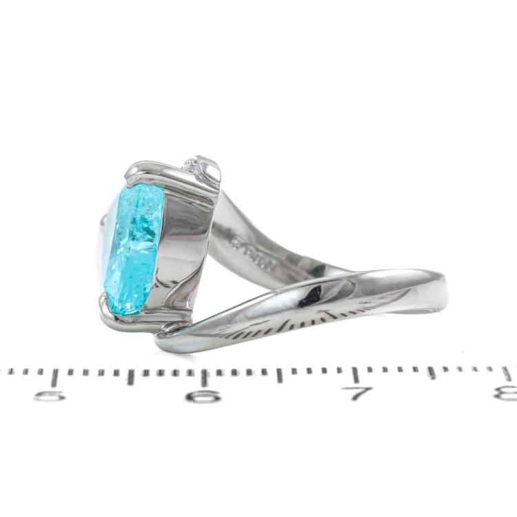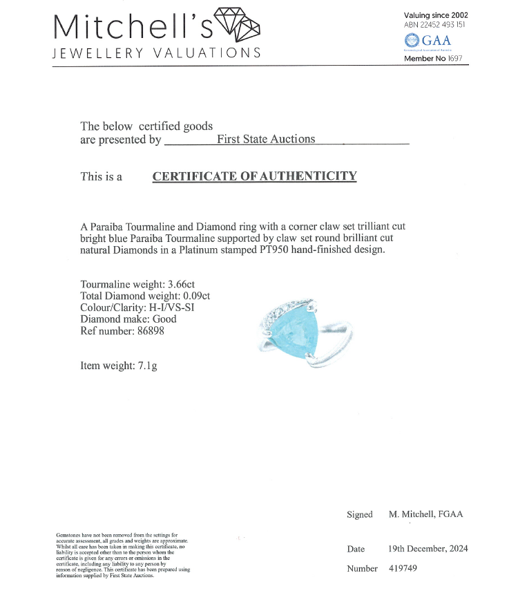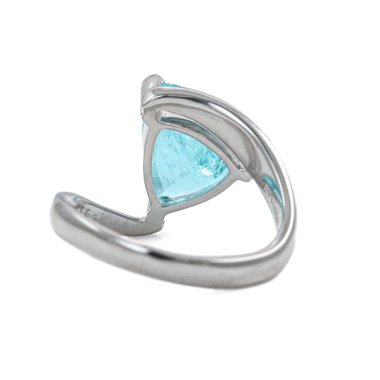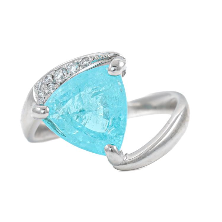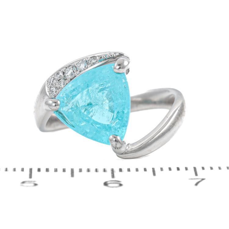 Tourmaline and Diamond ring with trilliant cut Natural Paraiba Tourmaline of 3.66ct and round Natural Diamonds totalling 0.09ct. Platinum - 950. Ring size: L1/2 - ring resizing is not recommended. Band width: 2.5mm - 3.8mm. Weight: 7.1g. With Certificate #419749. (Pre-owned)