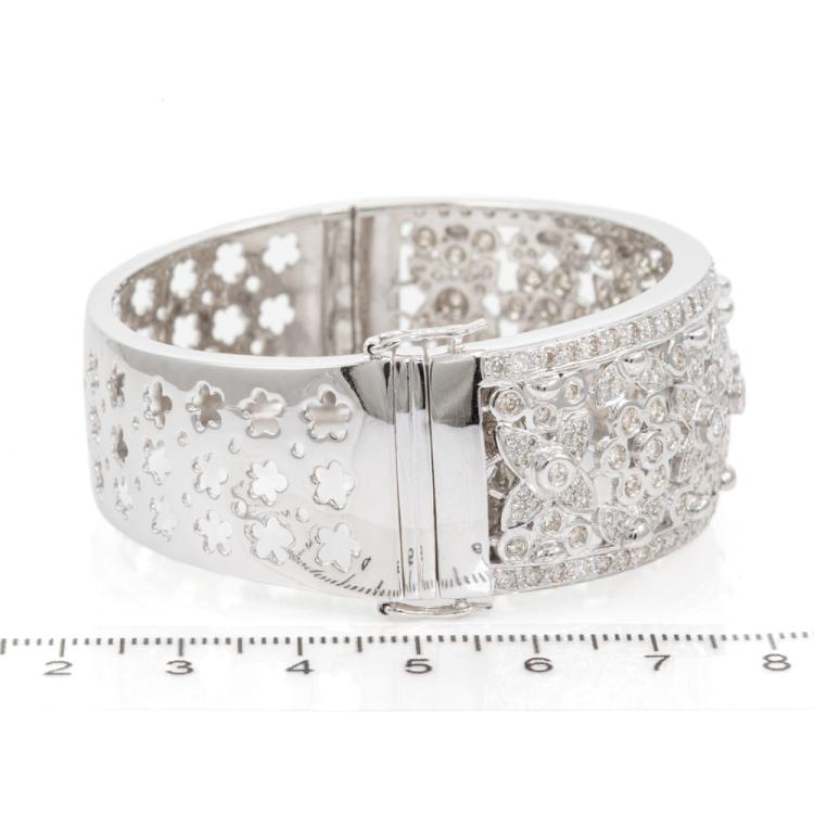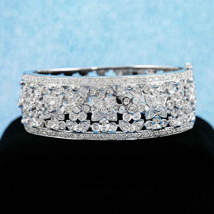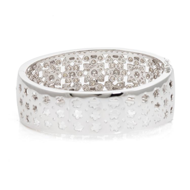Diamond oval shape bangle with round Natural Diamonds totalling 3.70ct (Estimated grading: I-J SI). Inner circumference: 16.5cm. Width: 1.8cm - 2.3cm. 18ct white gold (XRF tested, not stamped). Weight: 64.1g. With Valuation Certificate #418495. (Pre-owned)