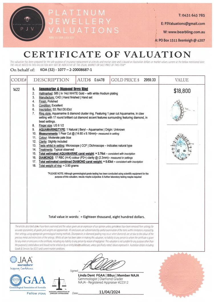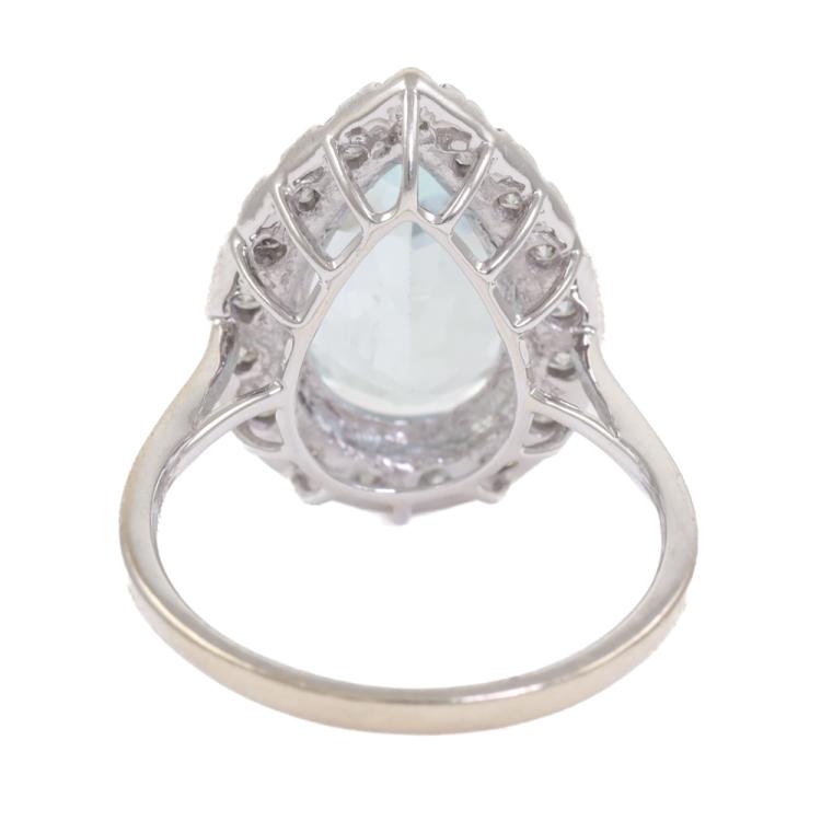 Aquamarine and Diamond ring with pear shape Natural Aquamarine of 3.76ct and round Natural Diamonds totalling 0.63ct (With Valuation Certificate graded as H-K P1). 14ct white gold. Ring size: L. Width: 1.7mm - 1.2mm. Weight: 3.9g (Pre-owned)