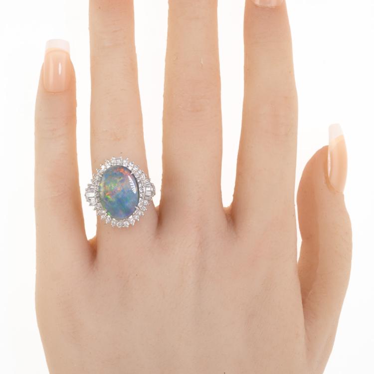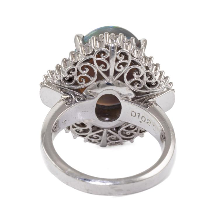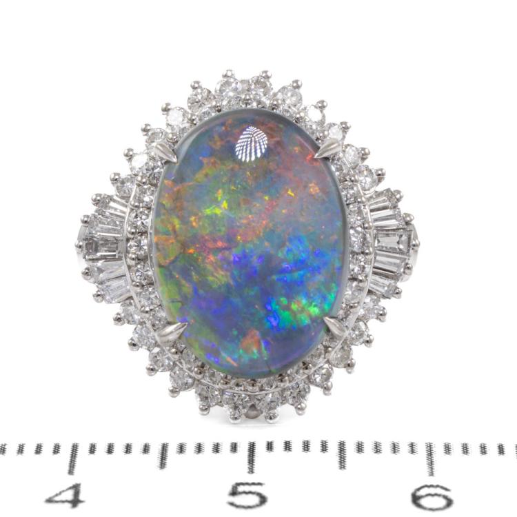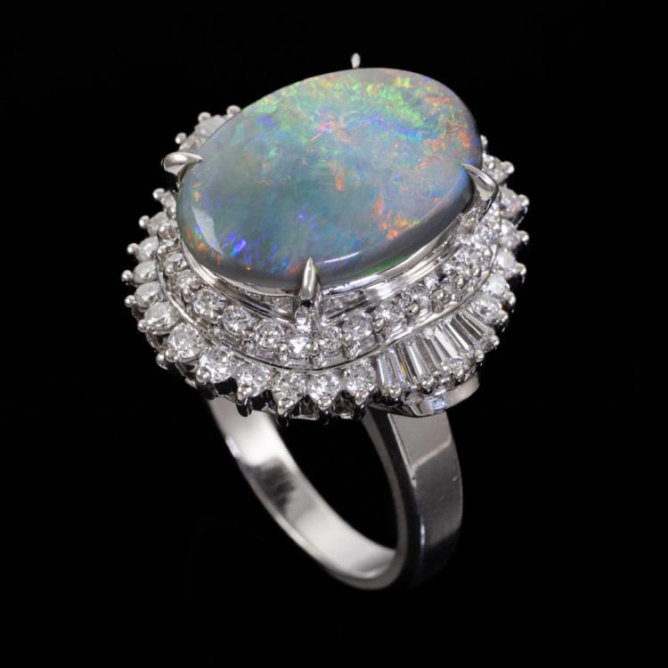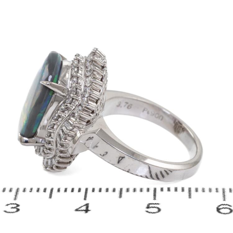 Opal and Diamond ring with oval cabochon cut Solid Black Natural Opal of 3.76ct and round & baguette cut Natural Diamonds totalling 1.02ct. (Estimated grading: G-I VS-SI.) Platinum 900. Ring size J. Band width: 2.7mm - 3.8mm. Weight: 14.7g. With Valuation Certificate: #419005. (Pre-owned)