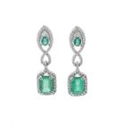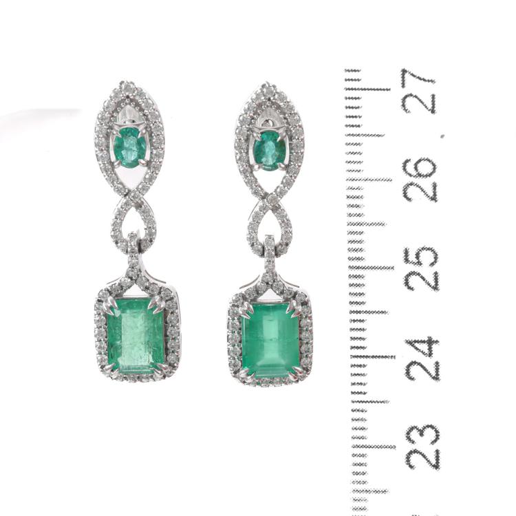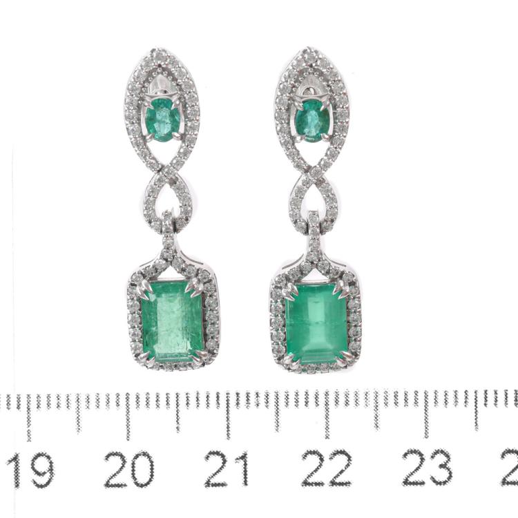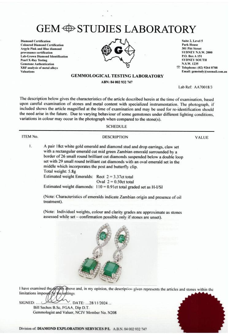 Emerald and Diamond drop earrings with oval & emerald cut Zambian Natural Emeralds totalling 3.87ct and round Natural Diamonds totalling 0.91ct (Estimated grading: H-I SI). 18ct white gold. Weight: 5.8g. With GSL Description Certificate #AA70018/3. (Pre-owned)