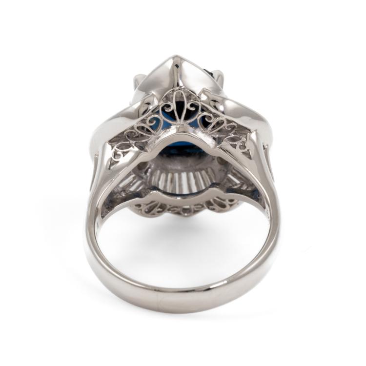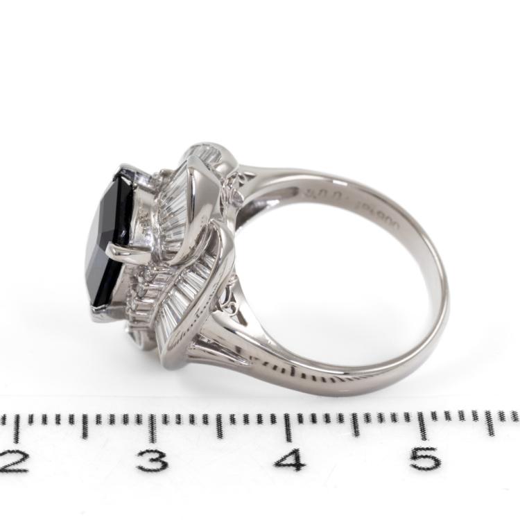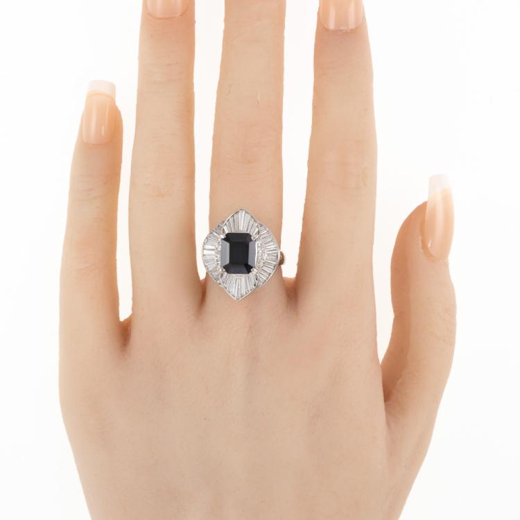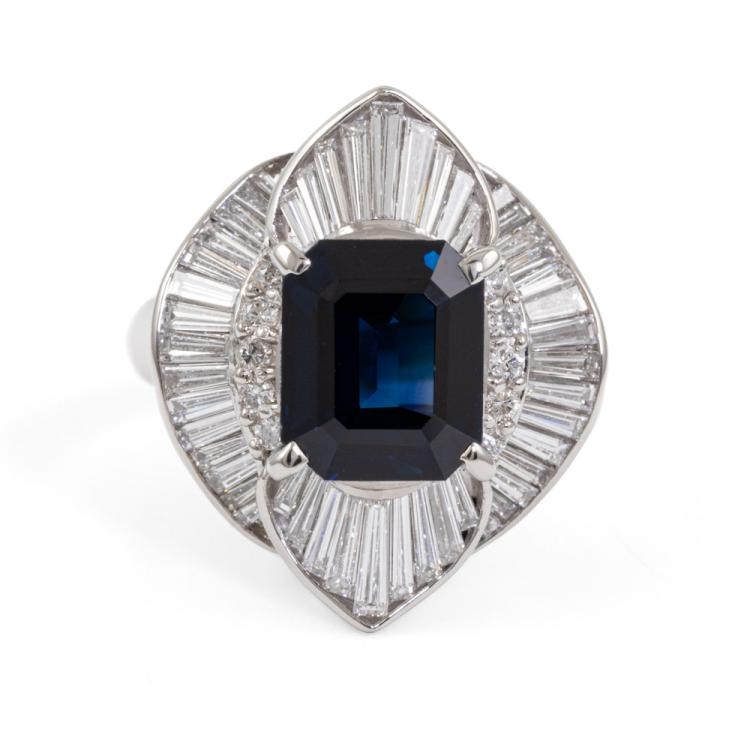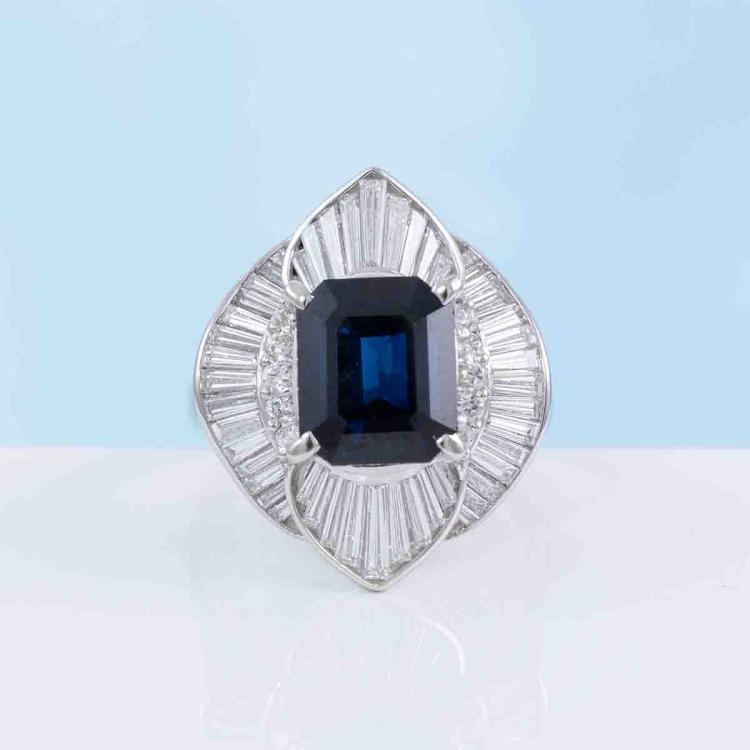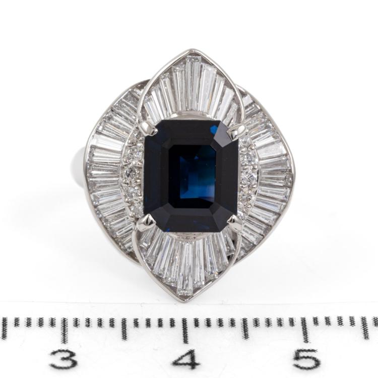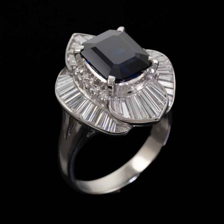 Sapphire and Diamond dress ring with emerald cut unheated Madagascar natural blue Sapphire of 3.88ct and round & baguette cut natural Diamonds totalling 1.40ct (Estimated grading: G VS). Platinum 900. Ring size: L1/2. Band width: 3.2mm- 5mm. Weight: 11.5g. With AIGS Certificate #GF24050050. (Pre-owned)