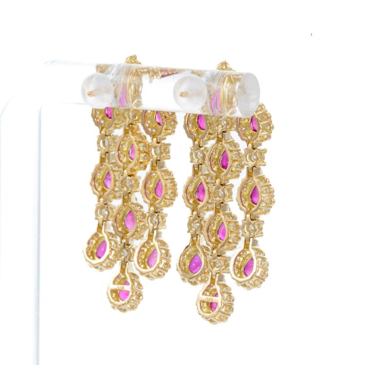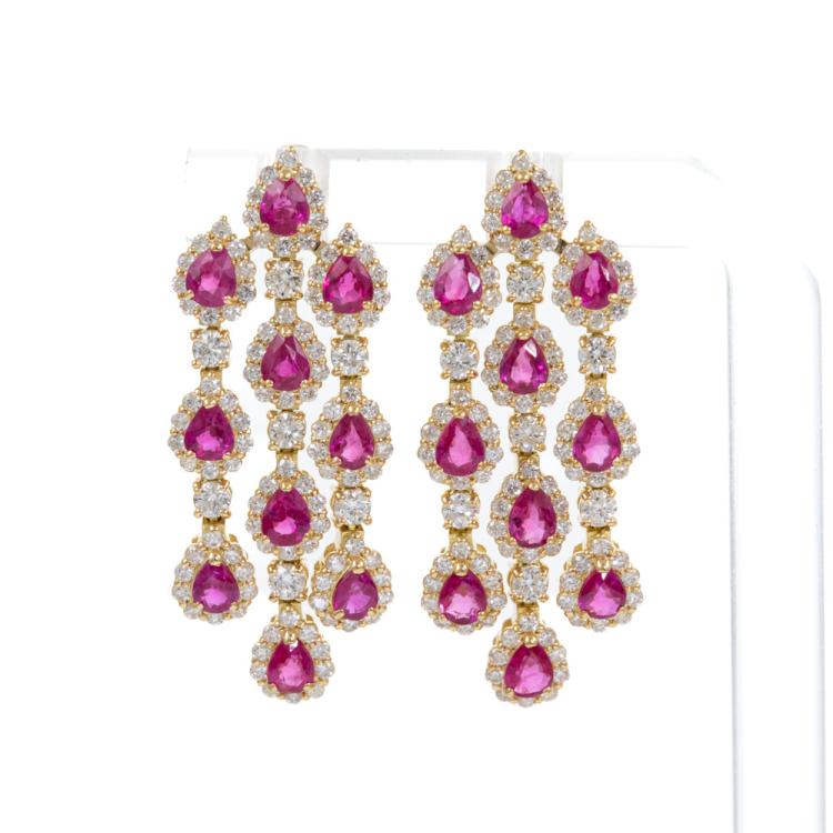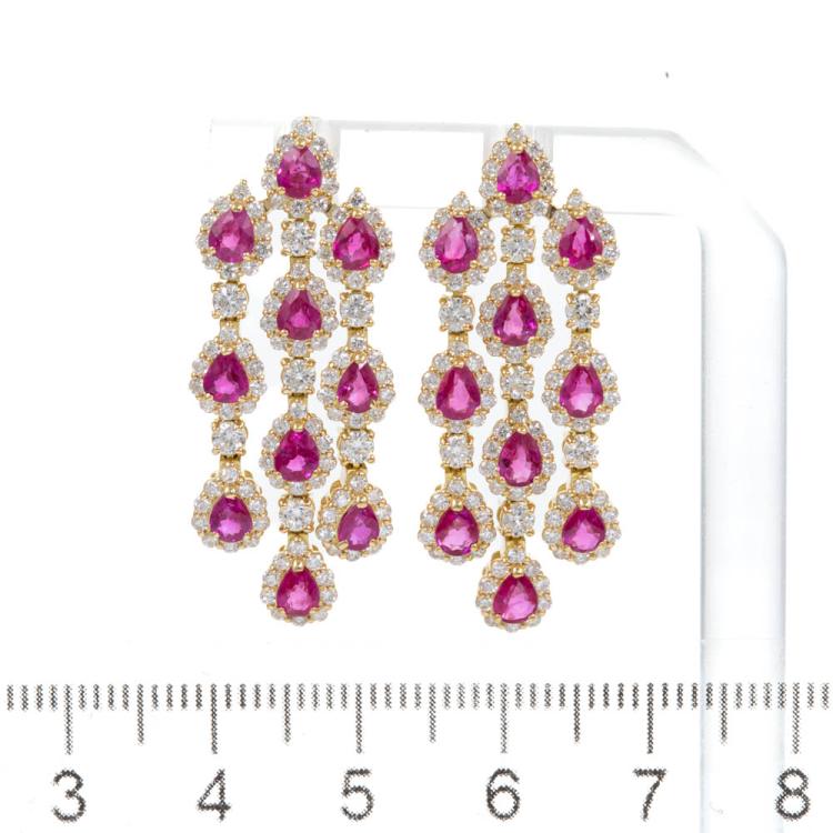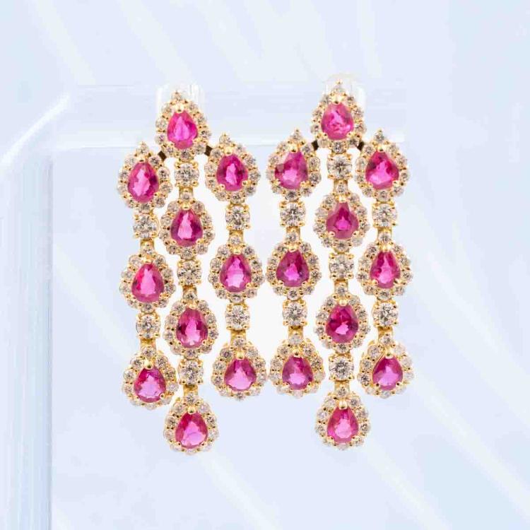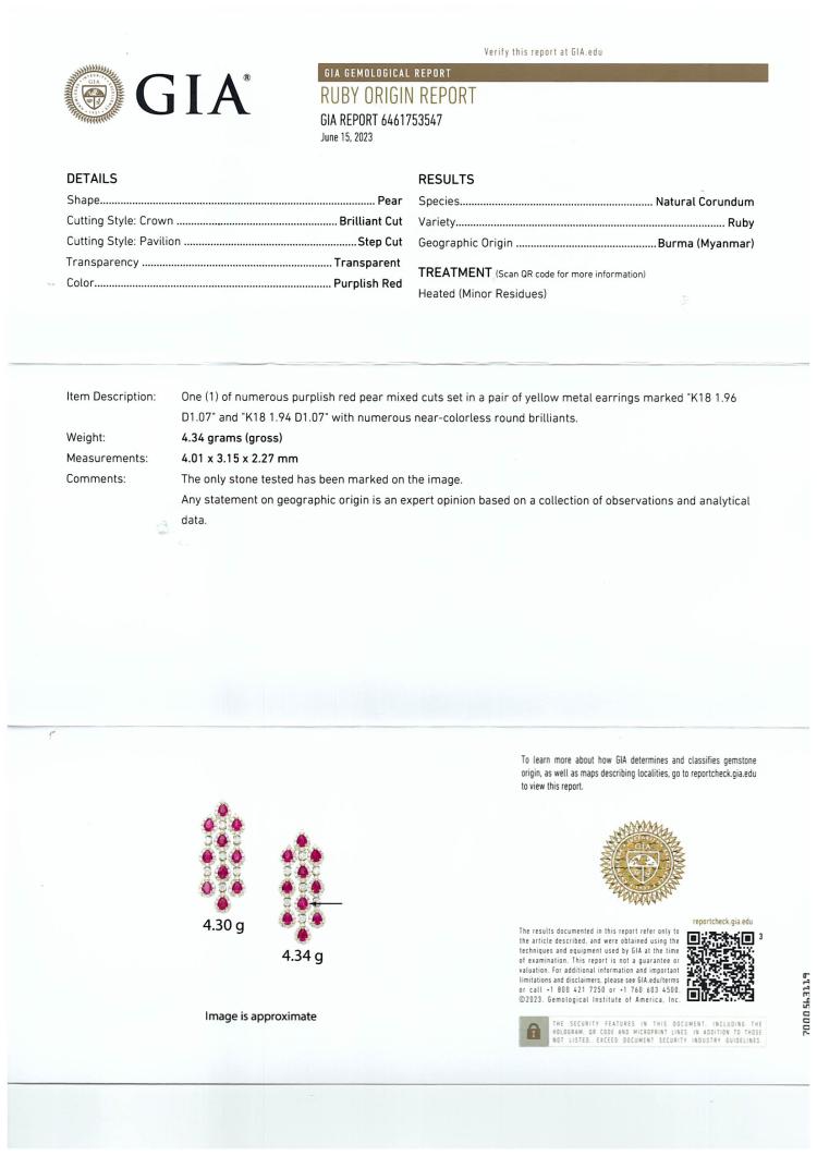 Ruby and Diamond earrings with pear shape Burmese Natural Rubies totalling 3.90ct (only 1 Ruby tested- with GIA Report of origin: Burma #6461753547) and round Natural Diamonds totalling 2.14ct (Estimated grading: G-H SI). 18ct yellow gold with silicon backs. Weight: 8.7g. (Pre-owned)