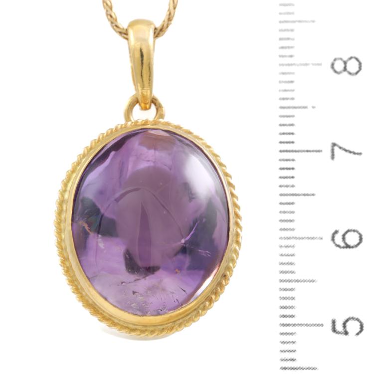 Amethyst pendant with an oval cabochon cut Natural Amethyst of approximately 40.00ct. 20ct yellow gold with 18ct yellow gold 44.5cm chain. Weight: 16.6g. (Pre-owned)