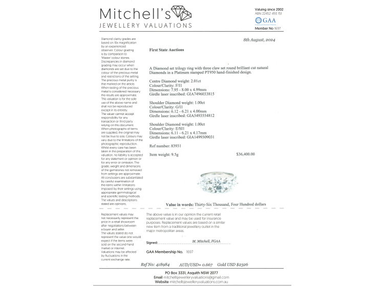 Diamond trilogy ring with 3 round brilliant cut Natural Diamonds totalling 4.01ct. Centre round brilliant cut Natural Diamond of 2.01ct (with GIA Report graded as F P1 #7496033815