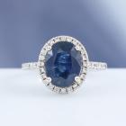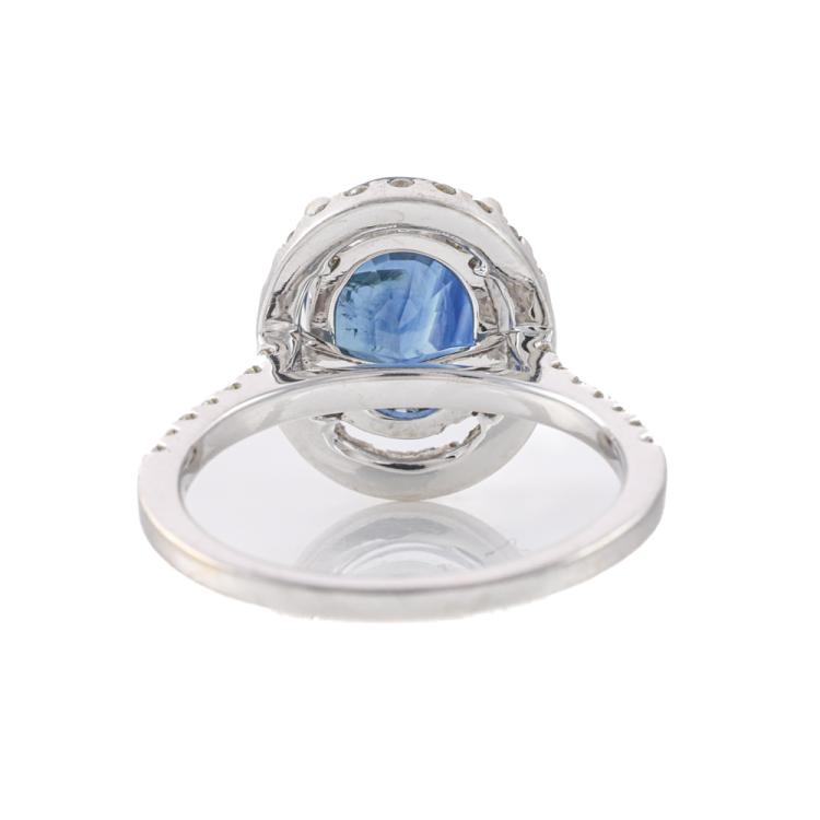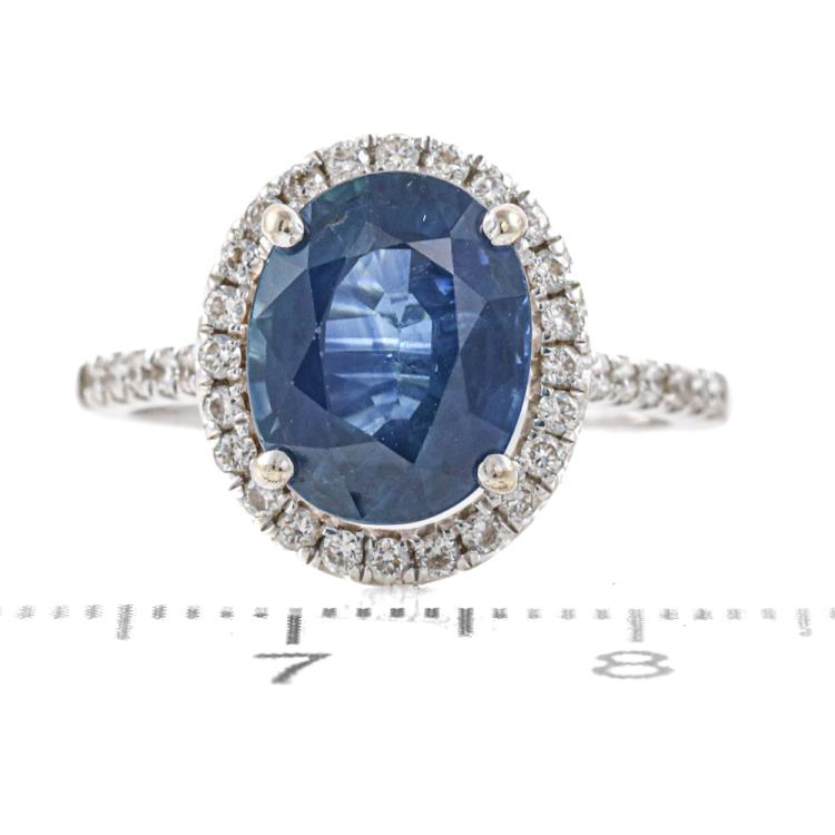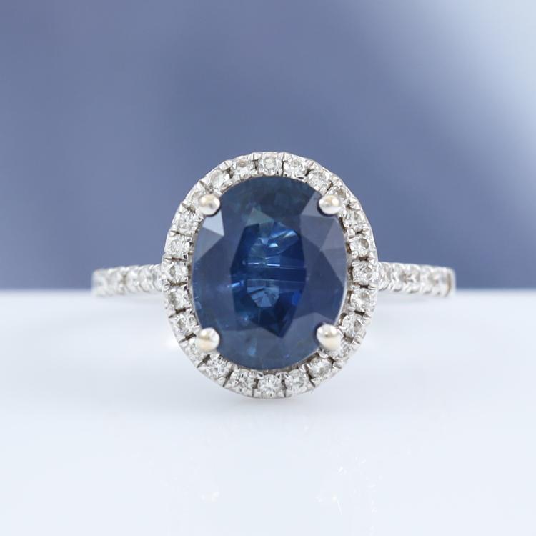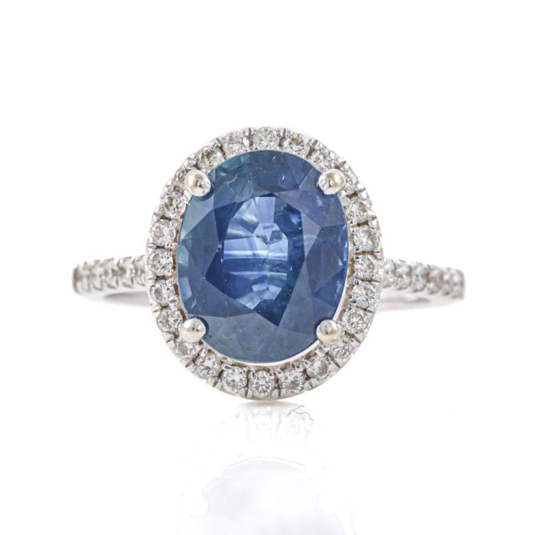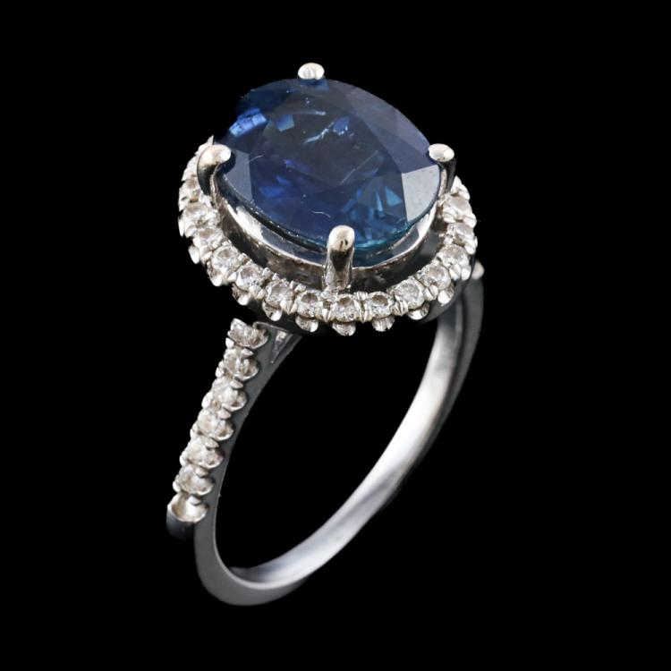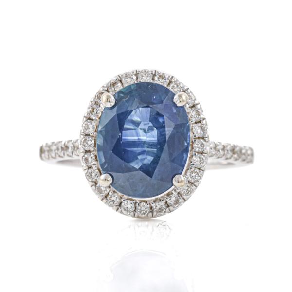 Sapphire and Diamond ring with centre oval blue Natural Sapphire of approximately 4.20ct and round Natural Diamonds totalling approximately 0.20ct. 18ct white gold. Ring size J1/2. Band width: 1.5mm-1.8mm. Weight: 5.2g. (Pre-owned)
