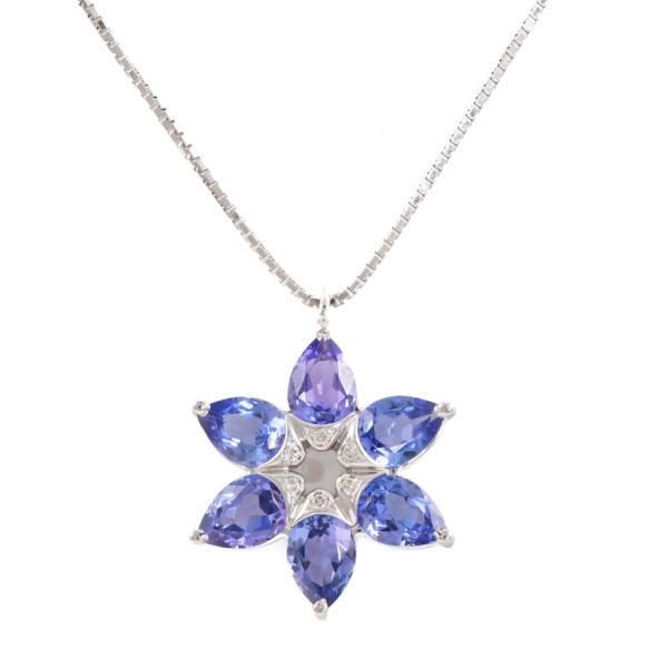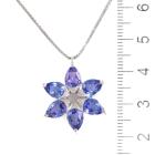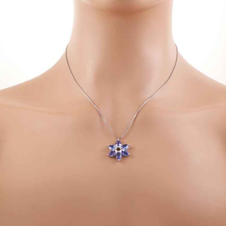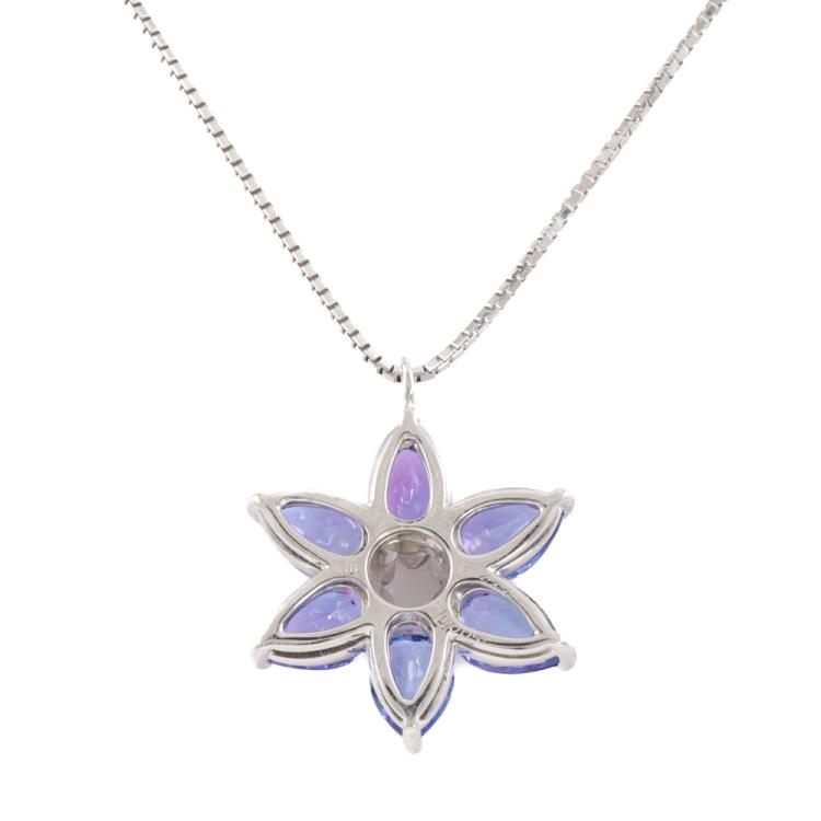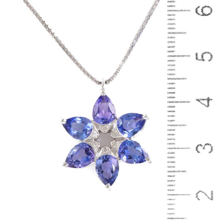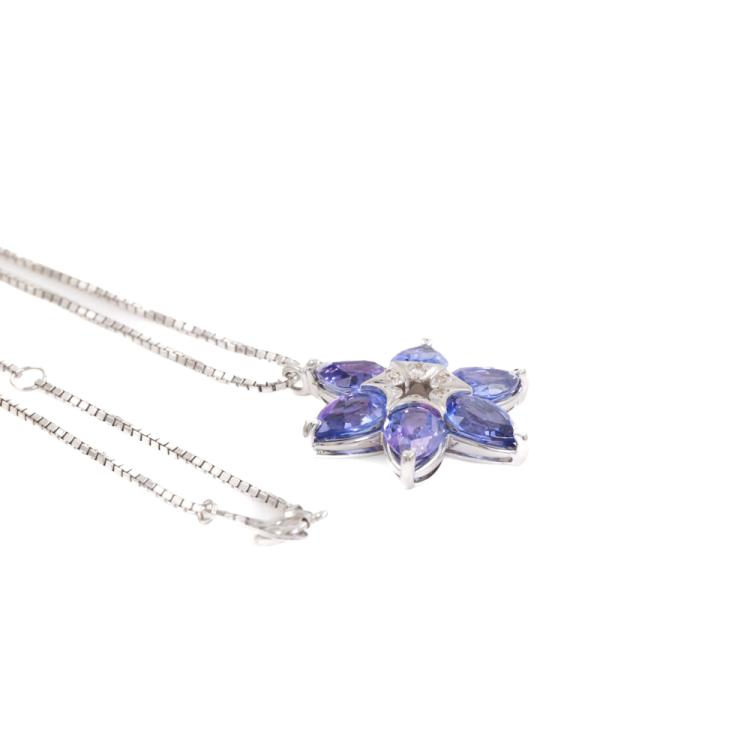 Tanzanite and Diamond pendant with pear shape Natural Tanzanite totalling 4.44ct and round Natural Diamonds totalling 0.05ct. 18ct white gold with 43cm 18ct white gold adjustable chain. Weight: 8.5g. (Pre-owned)
