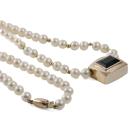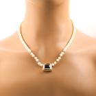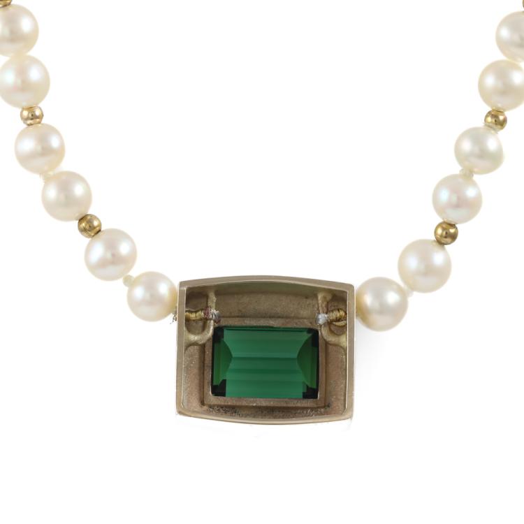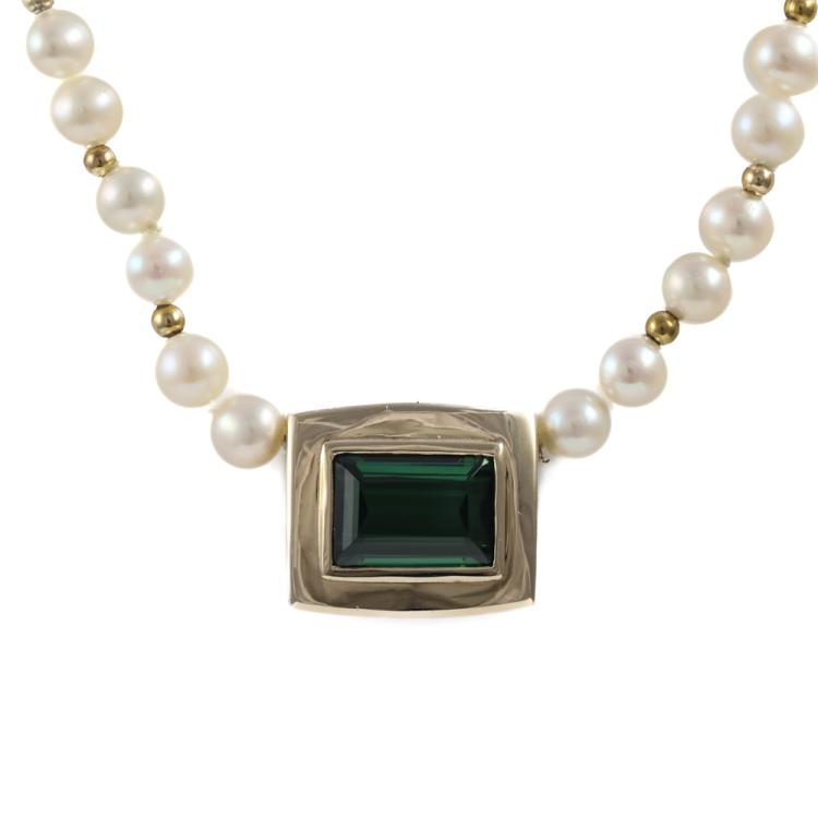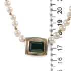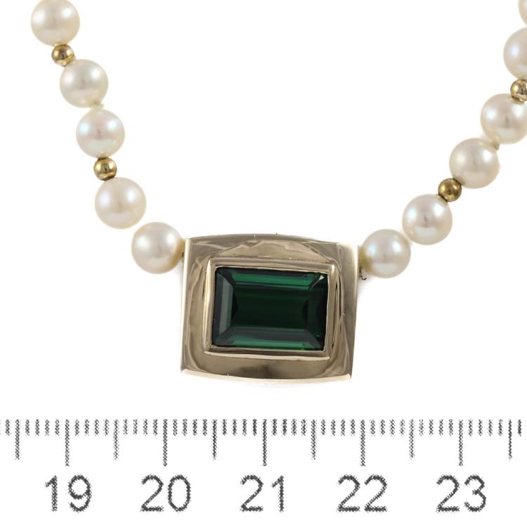 Tourmaline pendant with baguette cut green Natural Tourmaline of approximately 4.50ct. Set in 9ct yellow gold with 78 Cultured Pearls (size: 5.1mm - 5.5mm) attached necklace. Length: 46cm. Weight: 24.3g. (Pre-owned)