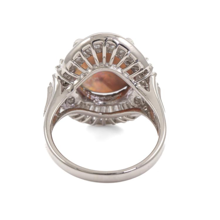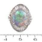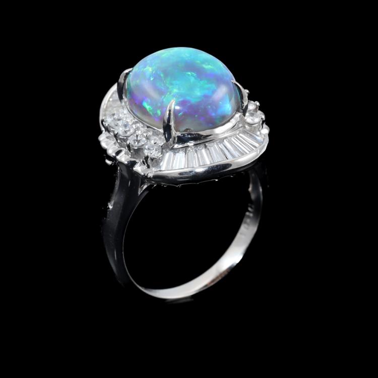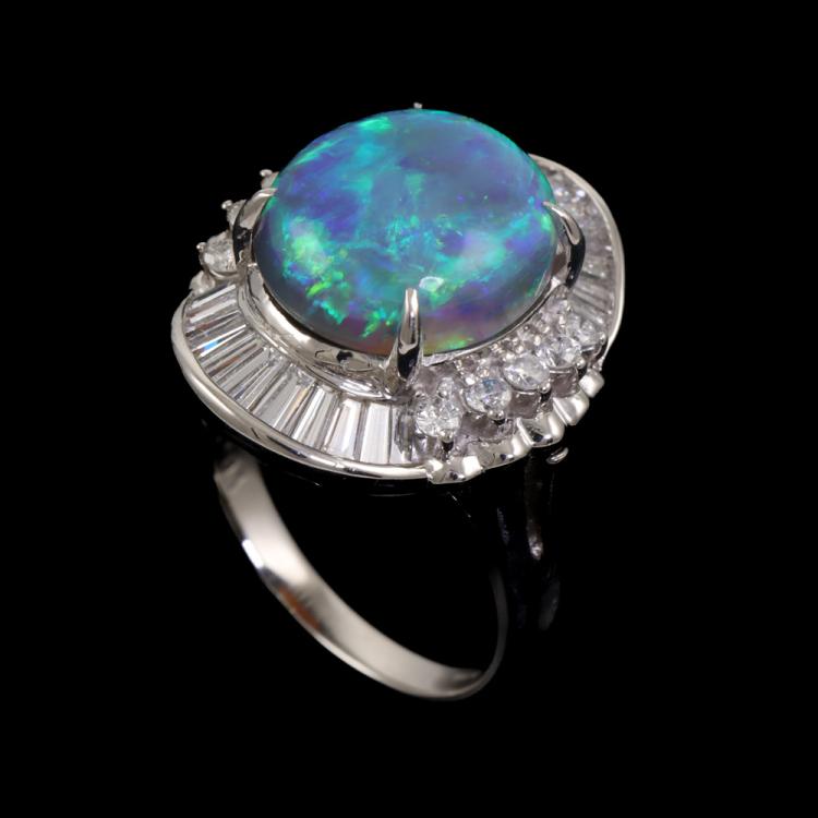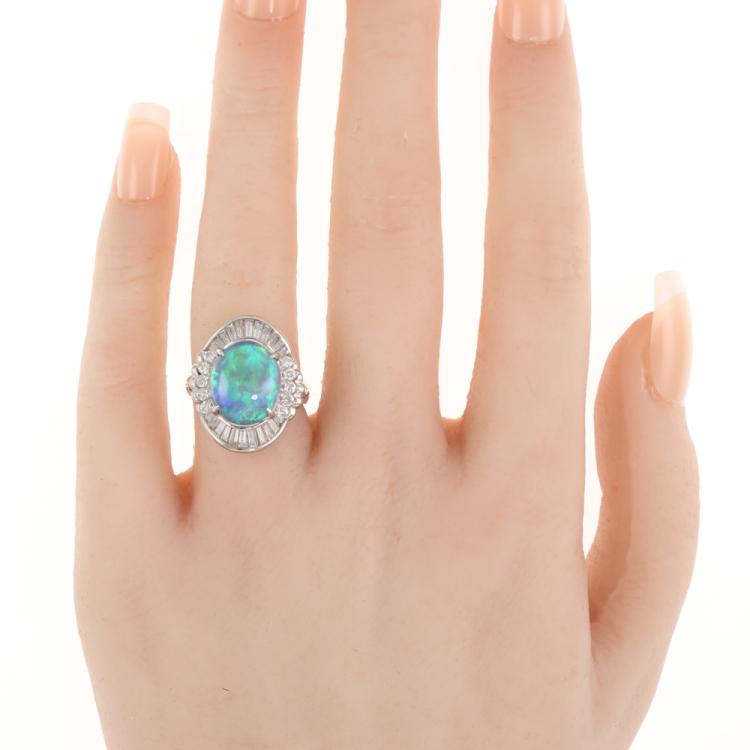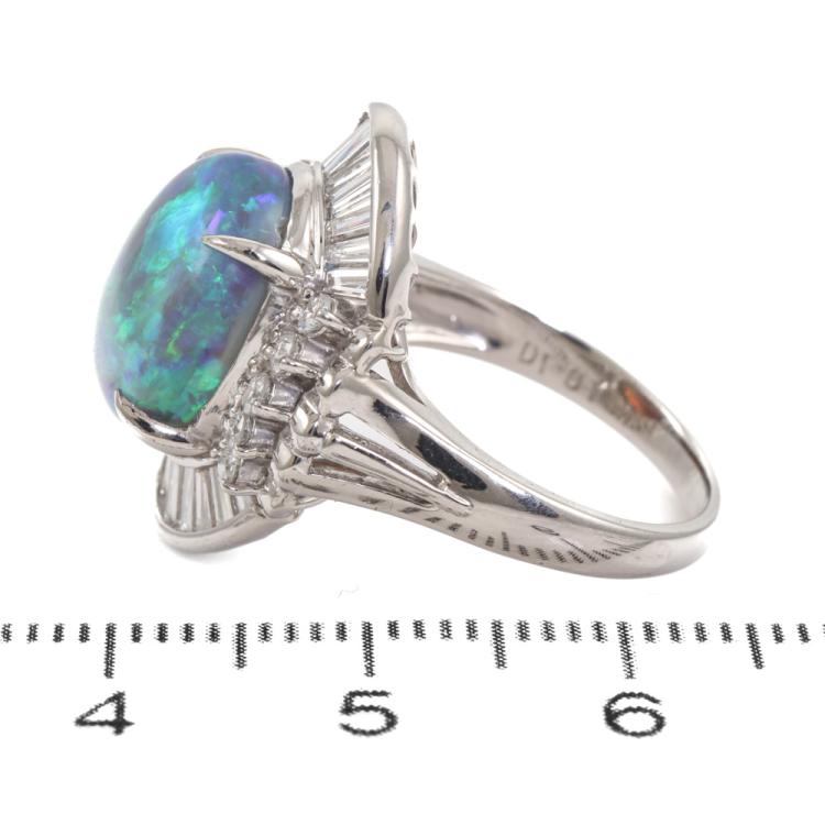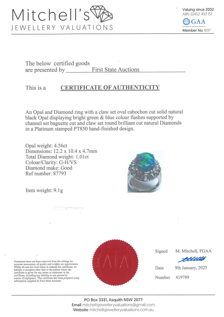 Opal and Diamond ring with oval shape Natural Black Opal of 4.56ct and baguette and round Natural Diamonds totalling 1.01ct (Estimated grading: G-H VS). Platinum - 850. Ring size: J1/2. Band width: 2.85mm - 3.49mm. Weight: 9.1g. With Certificate #419789. (Pre-owned)