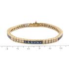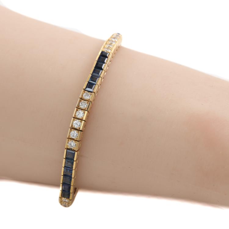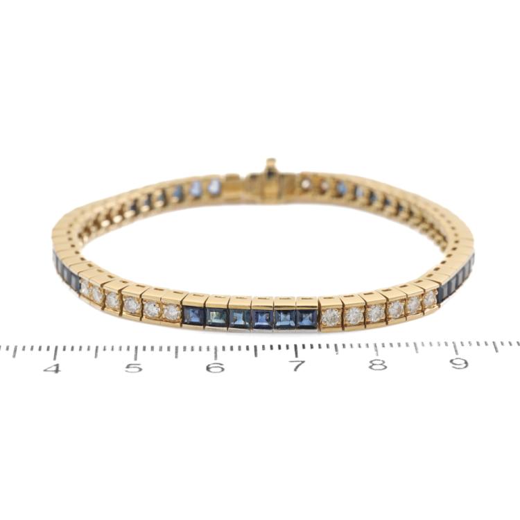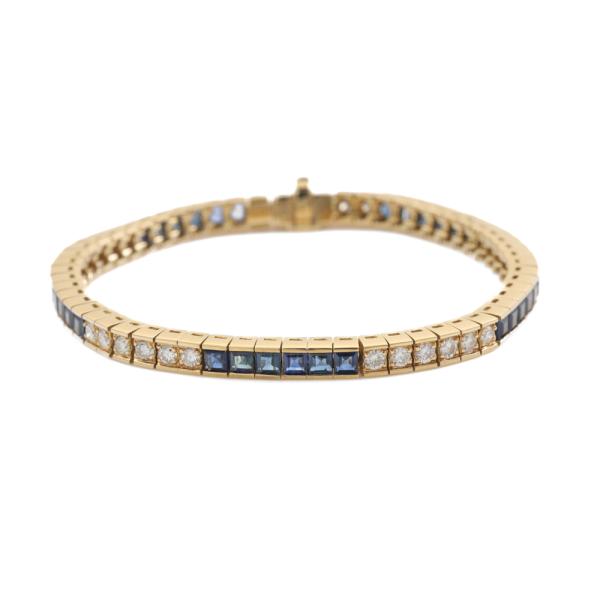 Sapphire and Diamond bracelet with square cut blue Natural Sapphires totalling 4.68ct and round Natural Diamonds totalling 1.58ct (Estimated grading: I-J SI). 18ct yellow gold. Length: 16.5cm. Weight: 20.9g. With certificate #419414. (Pre-owned)