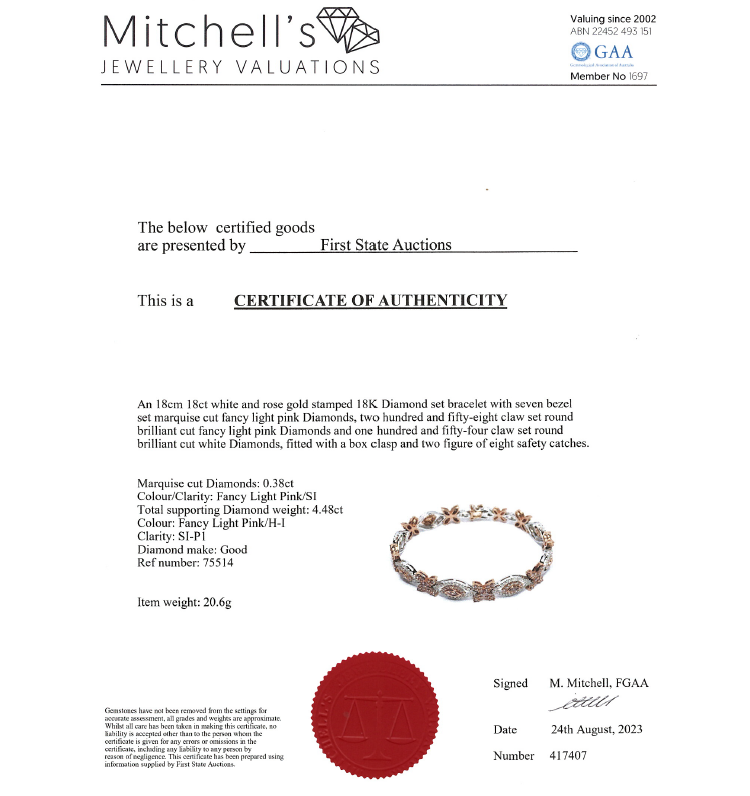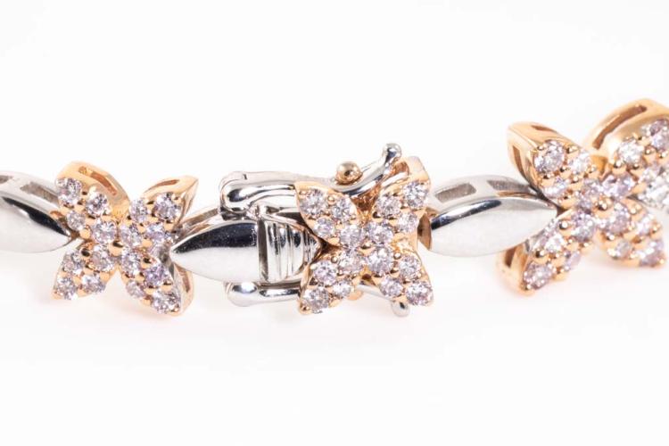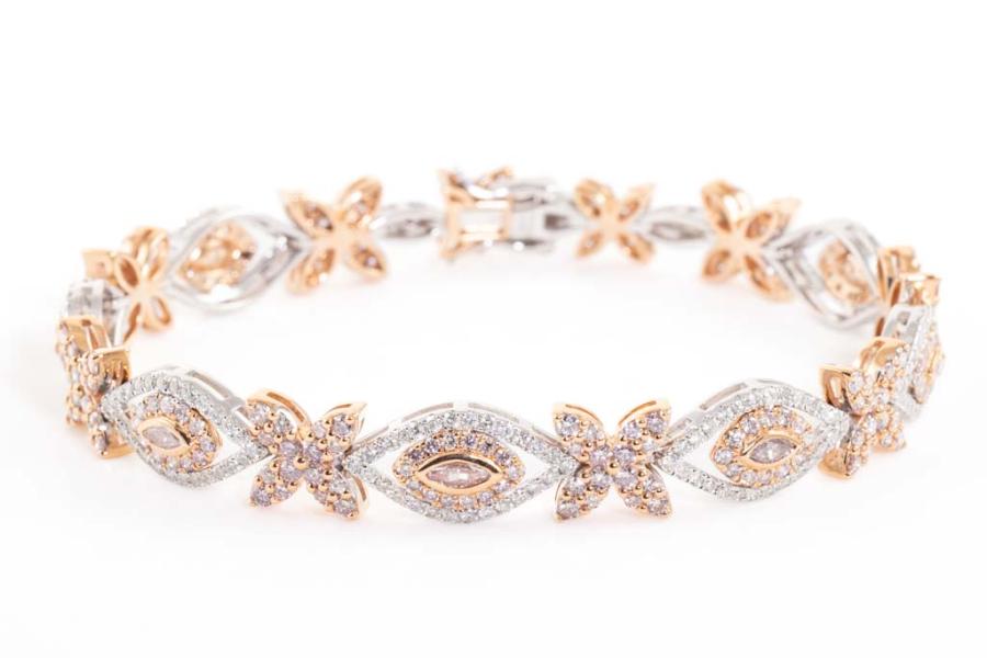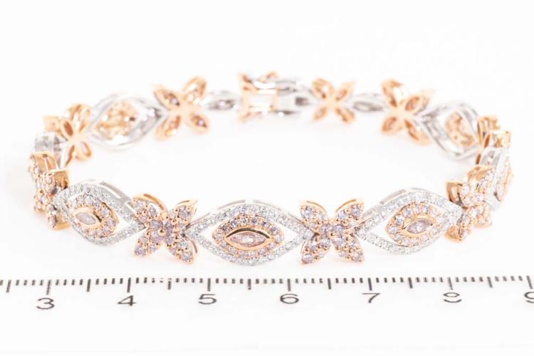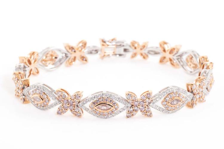 Diamond bracelet with marquise cut pink natural Diamonds totalling 0.38ct (Estimated grading: Fancy Light Pink SI) and round natural Diamonds totalling 4.48ct (Estimated grading: Fancy Light Pink & H-I SI-P1). 18ct rose and white gold. Length: 18cm. Weight: 20.6g. With Certificate #417407. (As new)