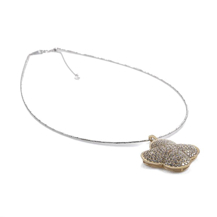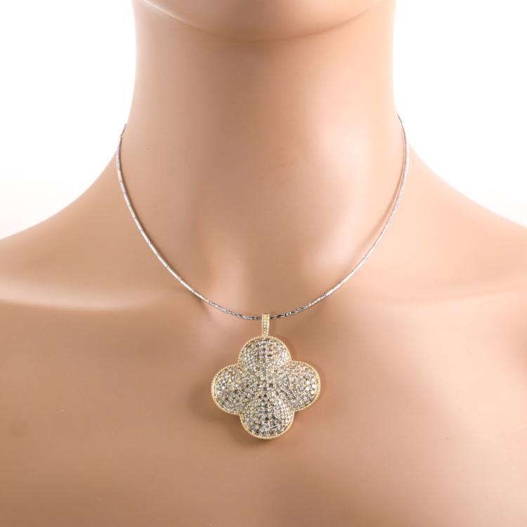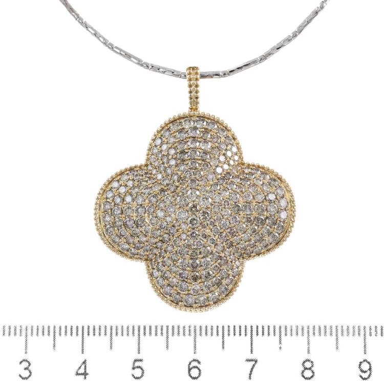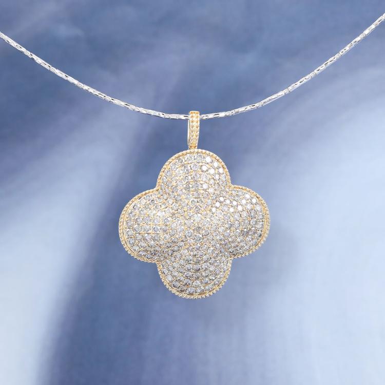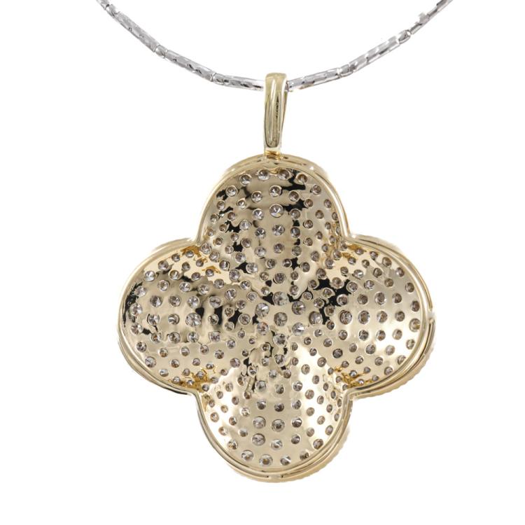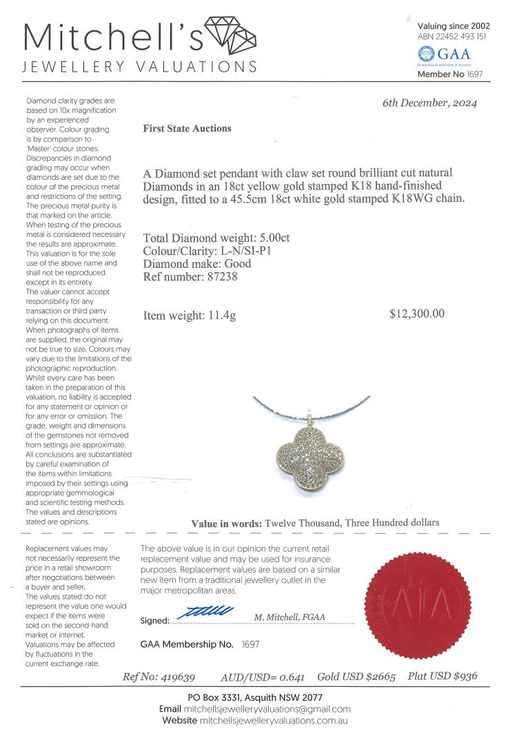 Clover design pendant with round Natural Diamonds totalling 5.00ct (Estimated grading: L-N SI-P1). 18ct yellow gold with 45.5cm 18ct white gold adjustable chain. Weight: 11.4g. With Valuation Certificate #419639. (Pre-owned)