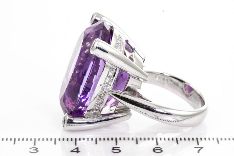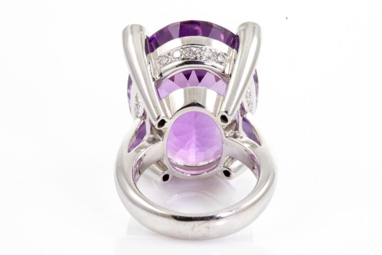 Amethyst and Diamond ring with oval Natural Amethyst of 50.55ct and round Natural Diamonds totalling 0.90ct (Estimated grading: G-H SI). 18ct white gold. Ring size P 1/2. Weight: 31.0g. With Certificate #417372. (Pre-owned)