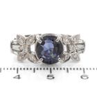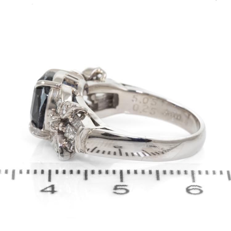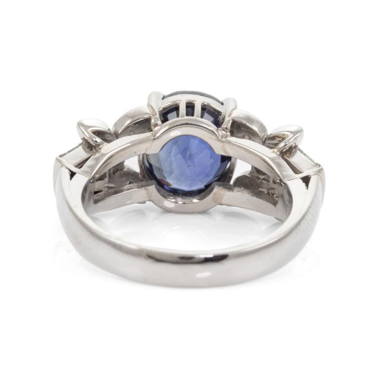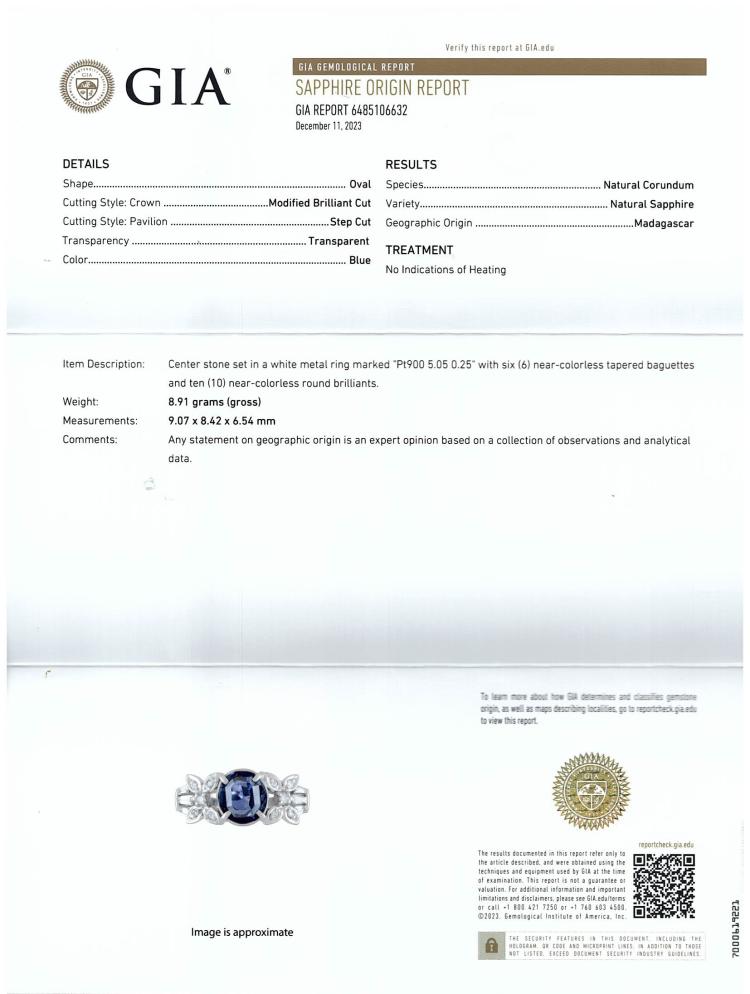Sapphire and Diamond ring with oval shape Unheated Madagascar natural blue Sapphire of 5.05ct and round & baguette cut natural Diamonds totalling 0.25ct. Platinum 900. Ring size N. Band width: 3.2mm - 4.4mm. Weight: 8.9g. With GIA Report #6485106632. (Pre-owned)