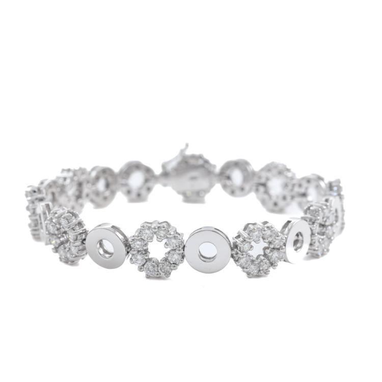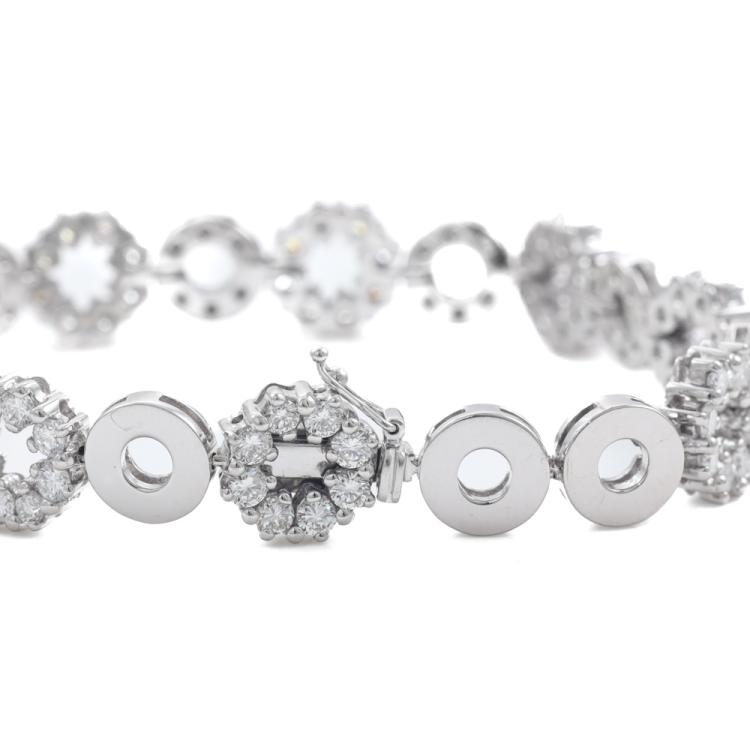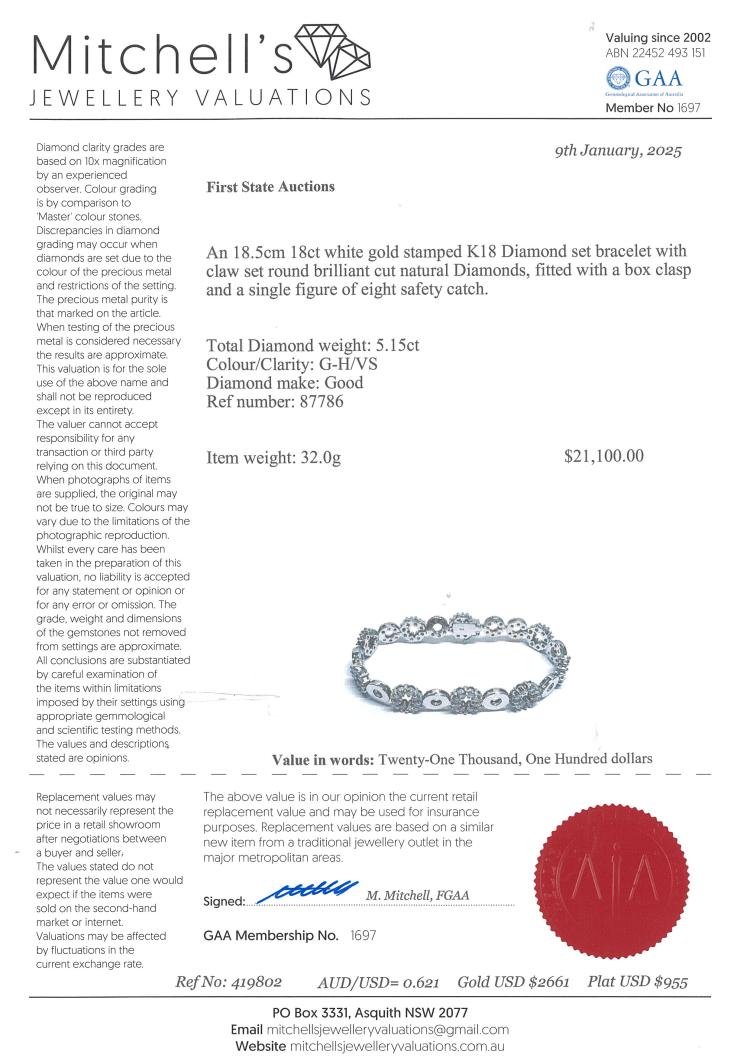 Diamond bracelet with round Natural Diamonds totalling 5.15ct (Estimated grading: G-H VS). 18ct white gold. Length: 18.5cm. Weight: 32.0g. With Certificate #419802. (Pre-owned)