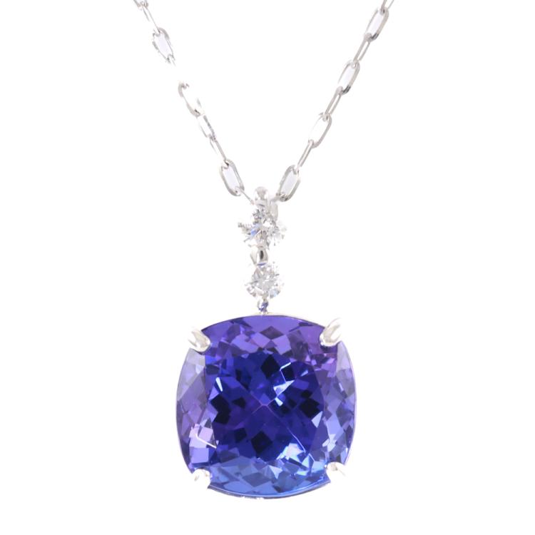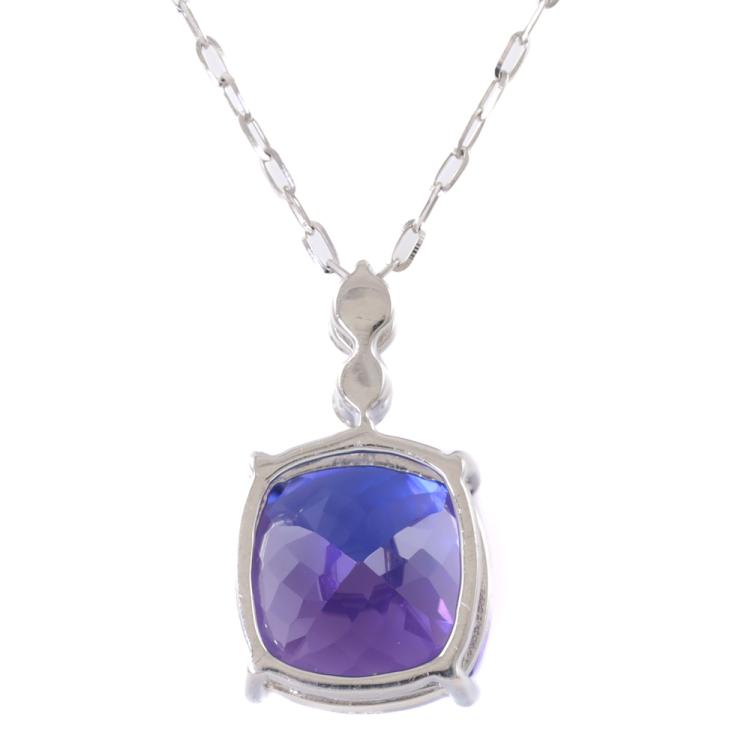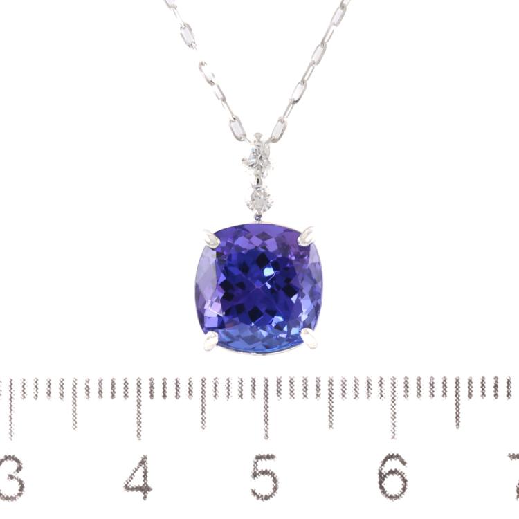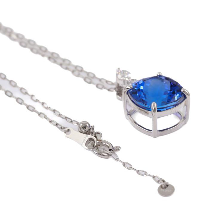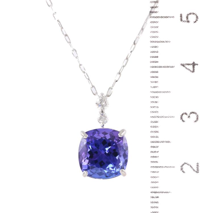 Tanzanite and Diamond necklace with cushion cut Natural Tanzanite of 5.26ct and round Natural Diamonds totalling 0.10ct. Platinum - 900, with Platinum - 850 45cm chain. Weight: 4.3g. (Pre-owned)