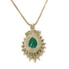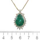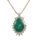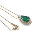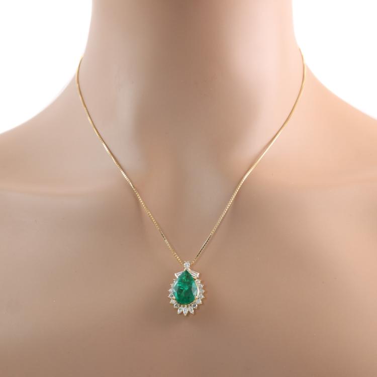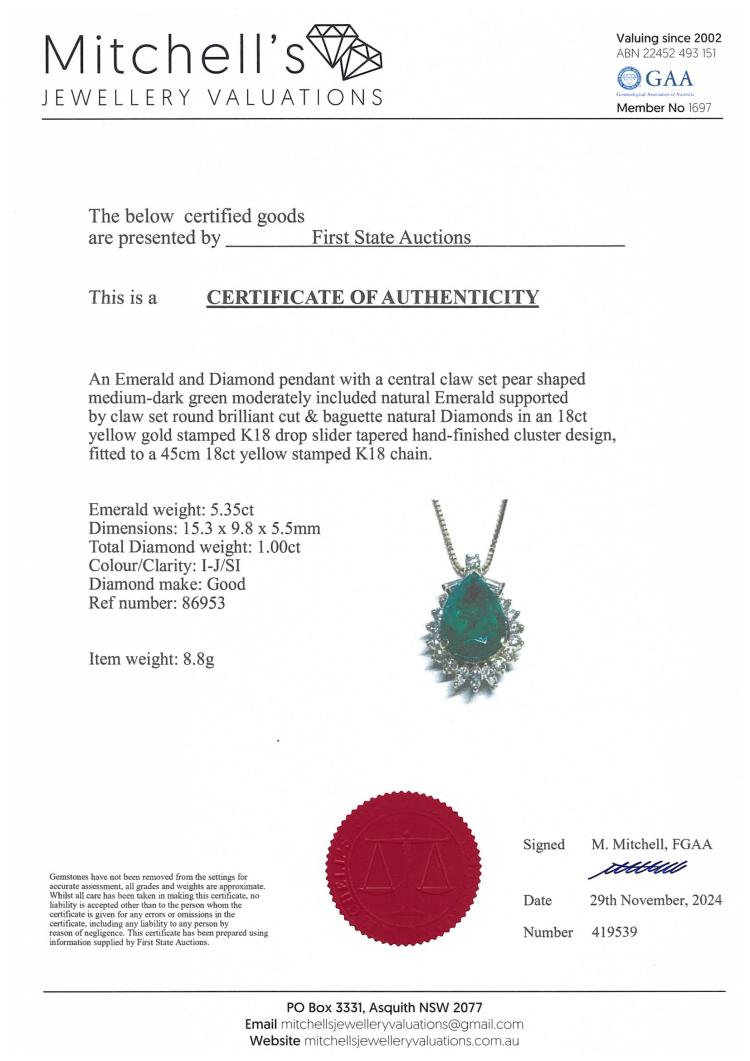 Emerald and Diamond pendant with pear shape Natural Emerald of 5.35ct and round, baguette & marquise cut Diamonds totalling 1.00ct (Estimated grading: I-J SI). 18ct yellow gold with 18ct yellow gold 45cm adjustable chain. Weight: 8.8g. With Certificate #419539. (Pre-owned)