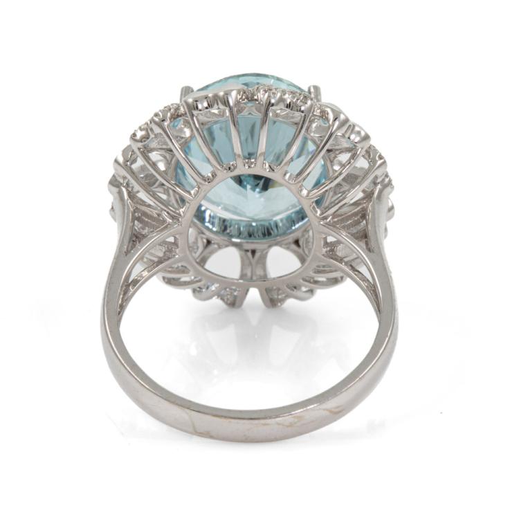 Aquamarine and Diamond ring with an oval shape natural Aquamarine of approximately 6.50ct and round natural Diamonds totalling 0.75ct (Estimated grading: I-J SI). 18ct white gold. Ring size M1/2. Band width: 3.1mm - 3.7mm. Weight: 6.9g. With Certificate #418659 (Pre-owned)