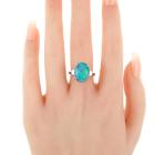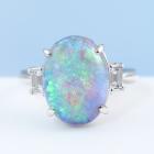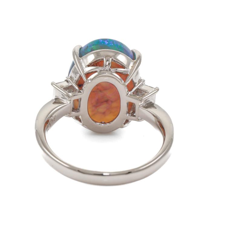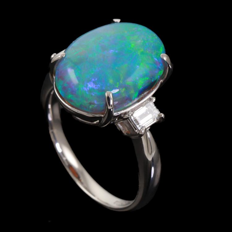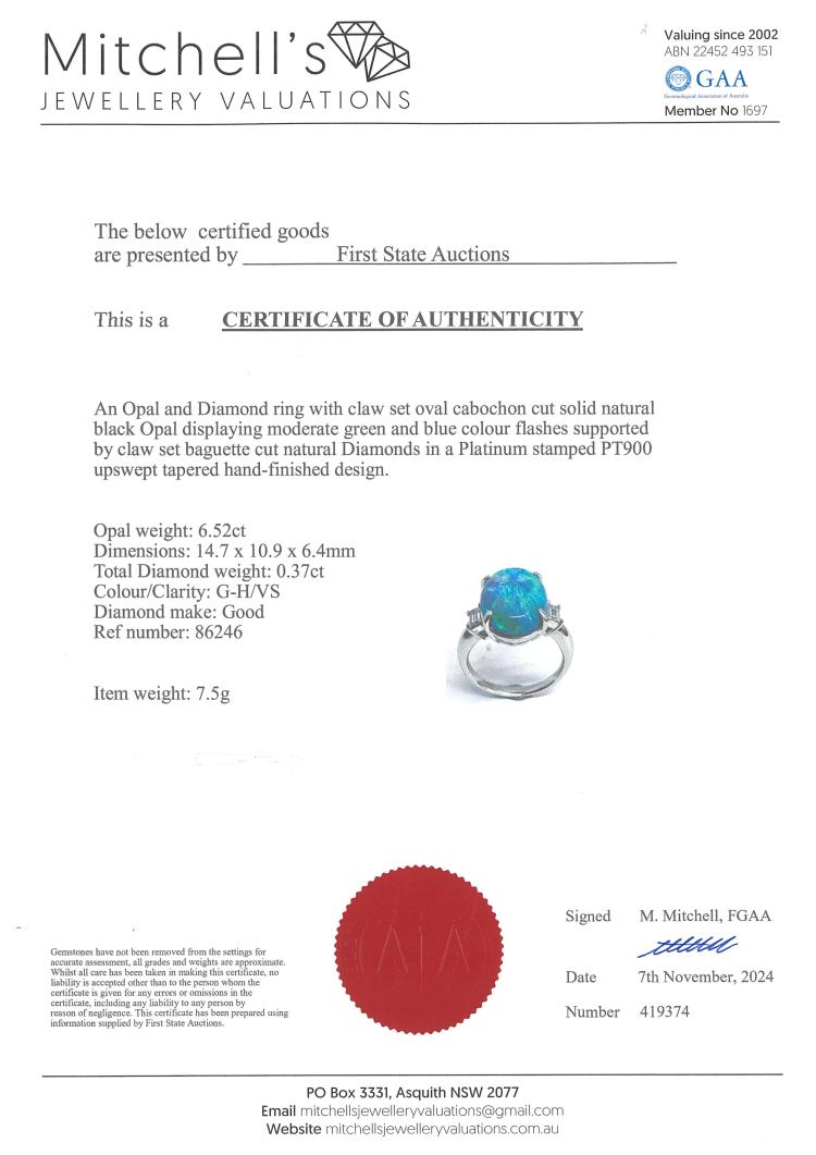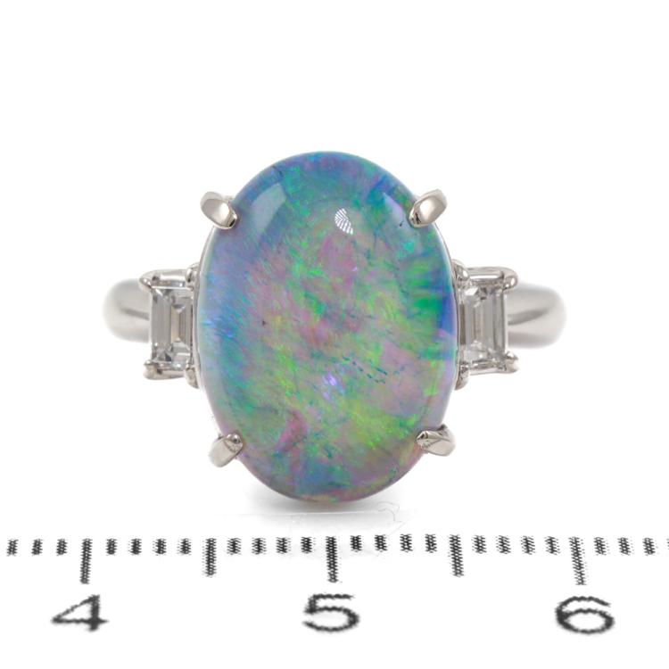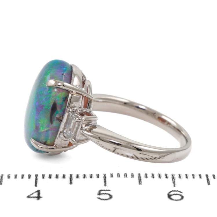 Opal and Diamond ring with oval cabochon cut solid Natural Black Opal of 6.52ct and baguette cut Natural Diamonds totalling 0.37ct (Estimated grading: G-H VS). Platinum-900. Ring size K½. Band width: 2.2mm-2.7mm. Weight: 7.2g. With Certificate #419374. (Pre-owned)
