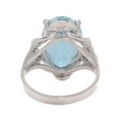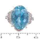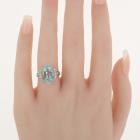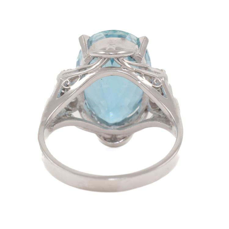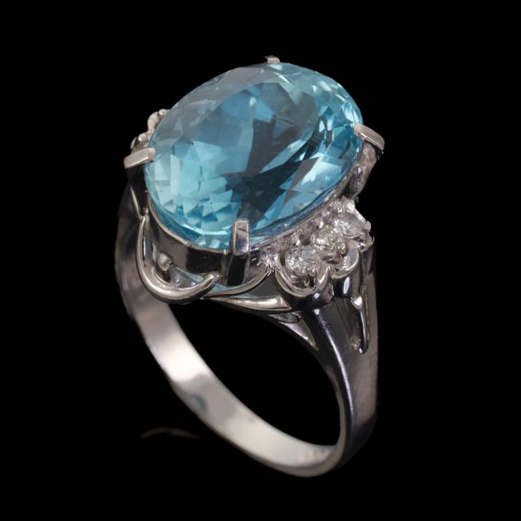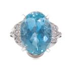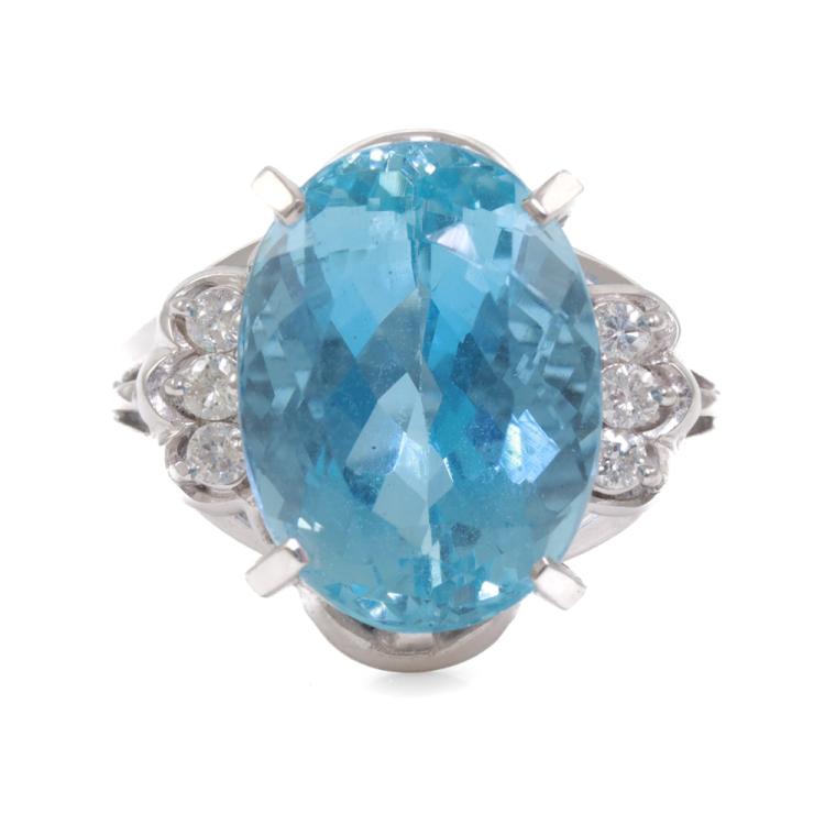 Aquamarine and Diamond ring with oval shape Natural Aquamarine of 6.53ct and round and baguette cut Natural Diamonds totalling 0.13ct. Platinum-900. Ring size: L. Band width: 2.3mm - 2.8mm. Weight: 7.2g. (Pre-owned)