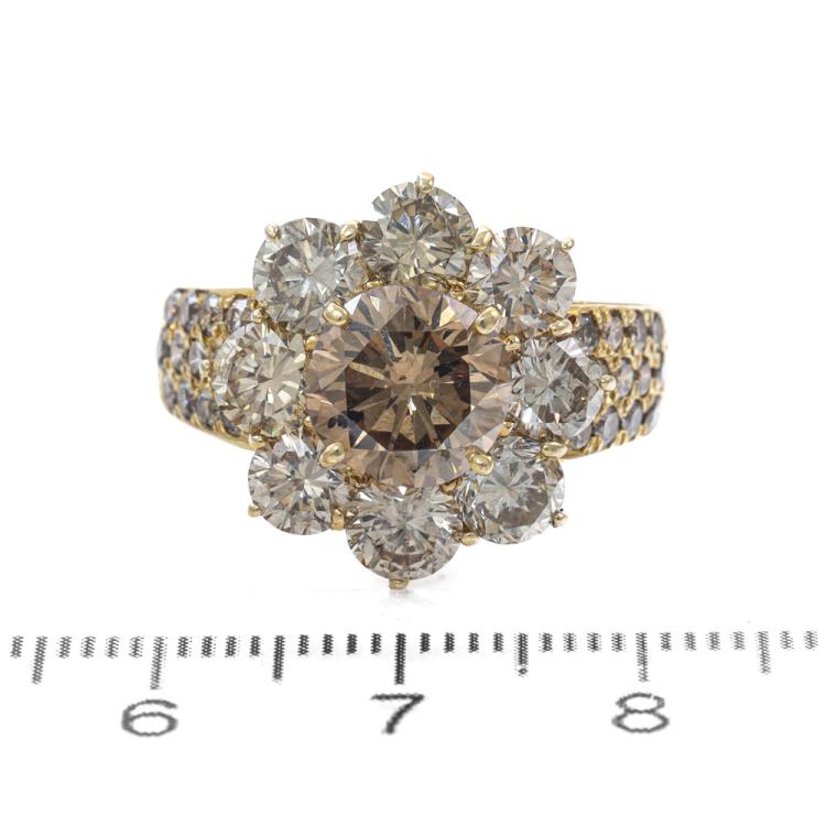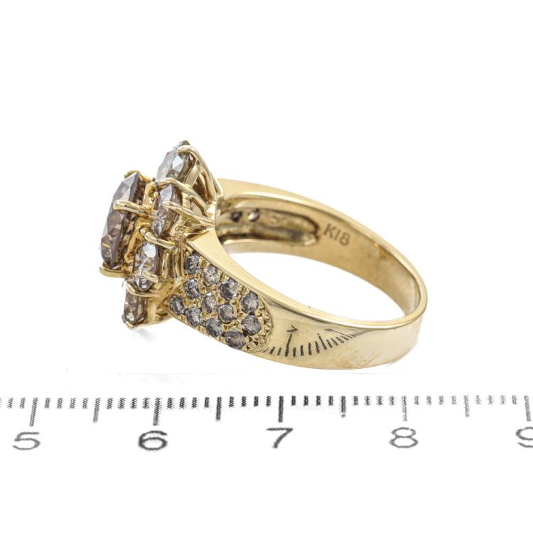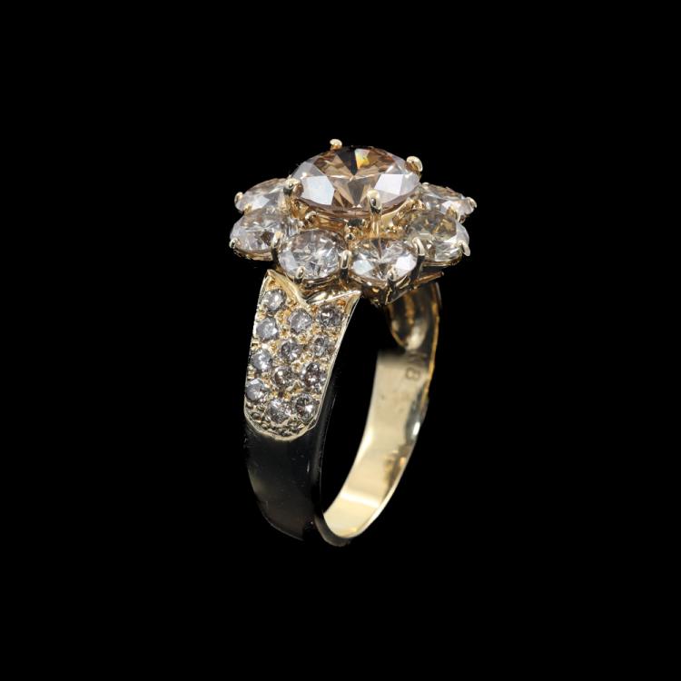 Diamond ring With Champagne Natural Diamonds totalling 6.65ct. With centre round Natural Diamond of 2.50ct (Estimated grading: Champagne P1) and surrounding round Natural Diamonds totalling 4.15ct (Estimated grading: Light Champagne SI-P1). 18ct yellow gold. Ring size: Q. Band width: 3.6mm - 5.6mm. Weight: 10.6g. With Valuation Certificate #419532. (Pre-owned)