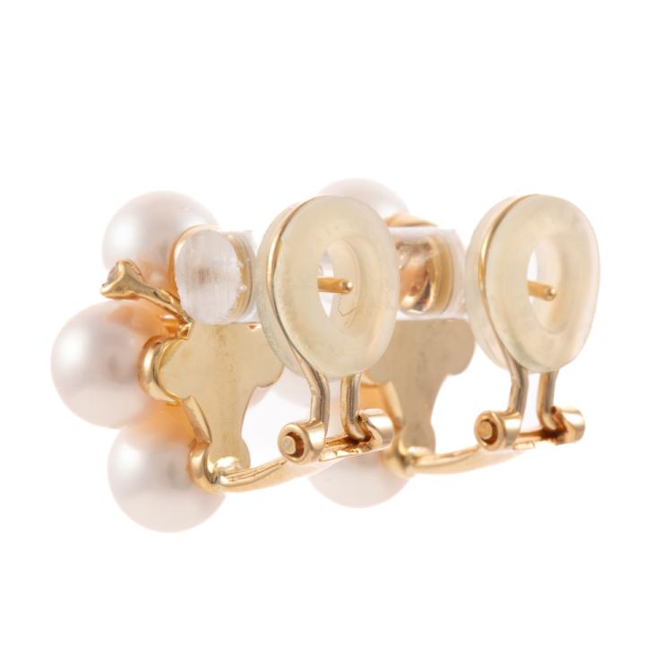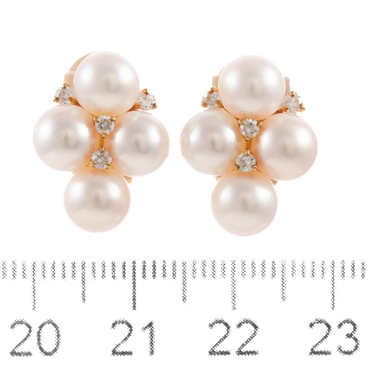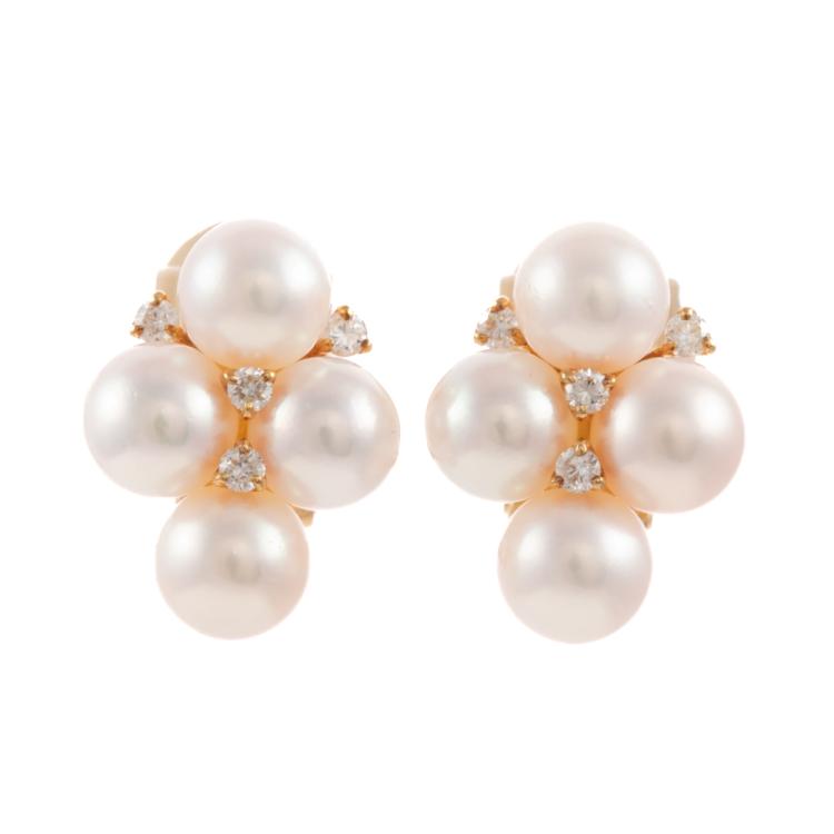 Pearl and Diamond clip-on earrings (for both pierced ears and non-pierced ears) with 8 Akoya Pearls of 6.6mm -6.9mm and round Natural Diamonds totalling 0.24ct. 18ct yellow gold. Weight: 9.1g. (Pre-owned)