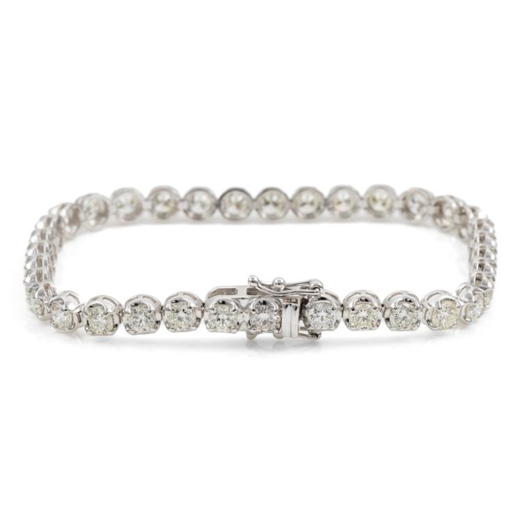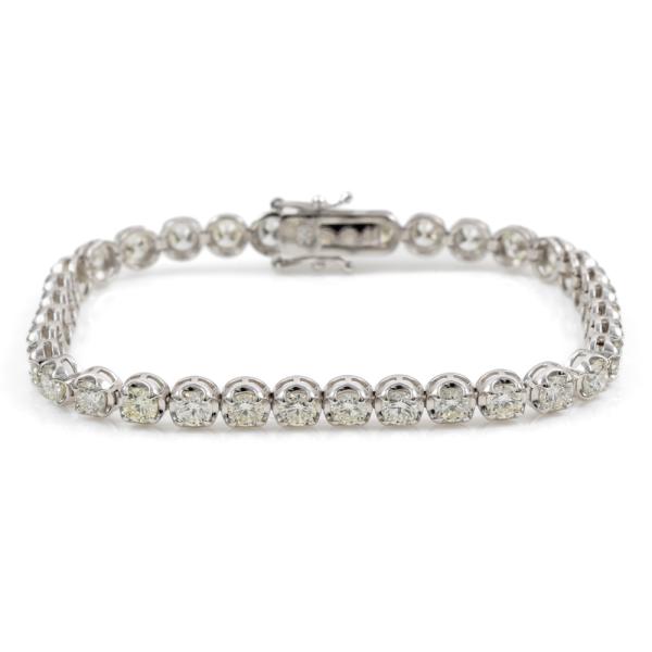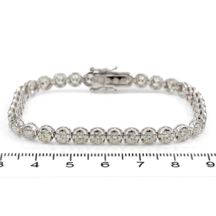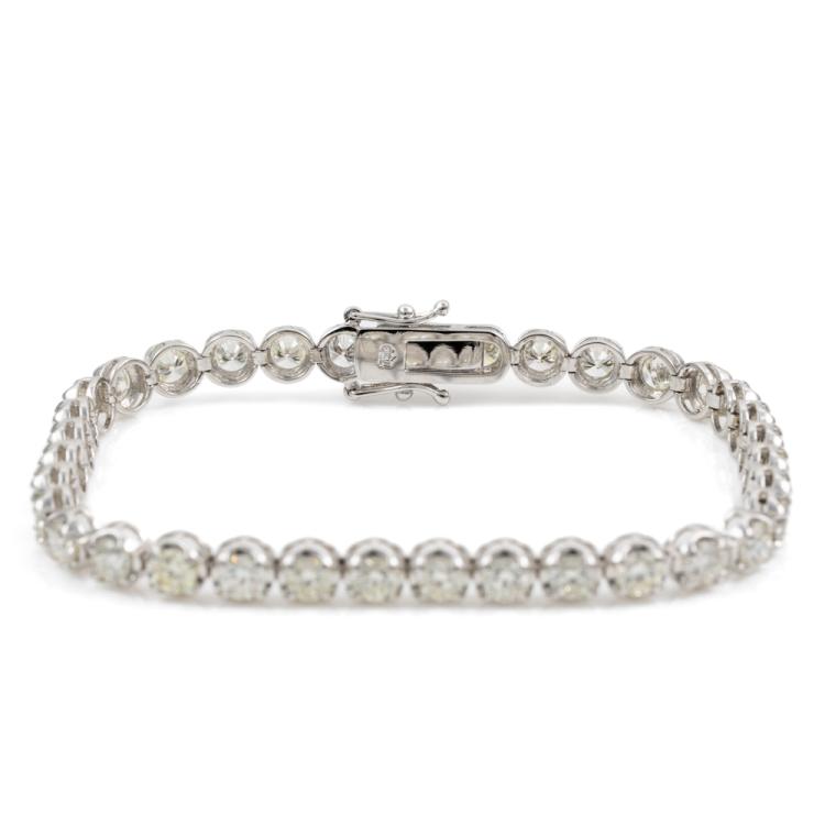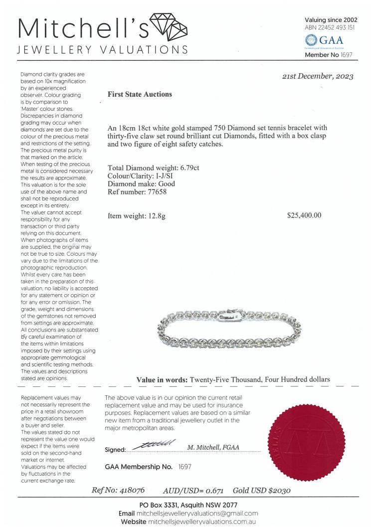 Diamond tennis bracelet with 35 round brilliant cut Natural Diamonds totalling 6.79ct. (Estimated grading: I-J SI) 18ct white gold. Length: 18cm. Weight: 12.8g. With Valuation Certificate #418076. (New)