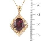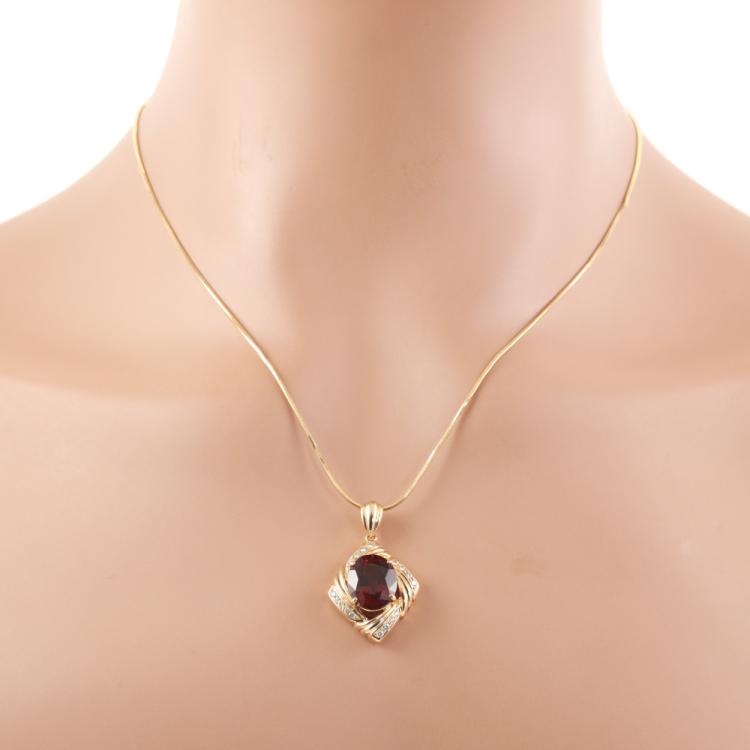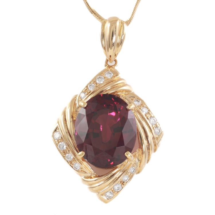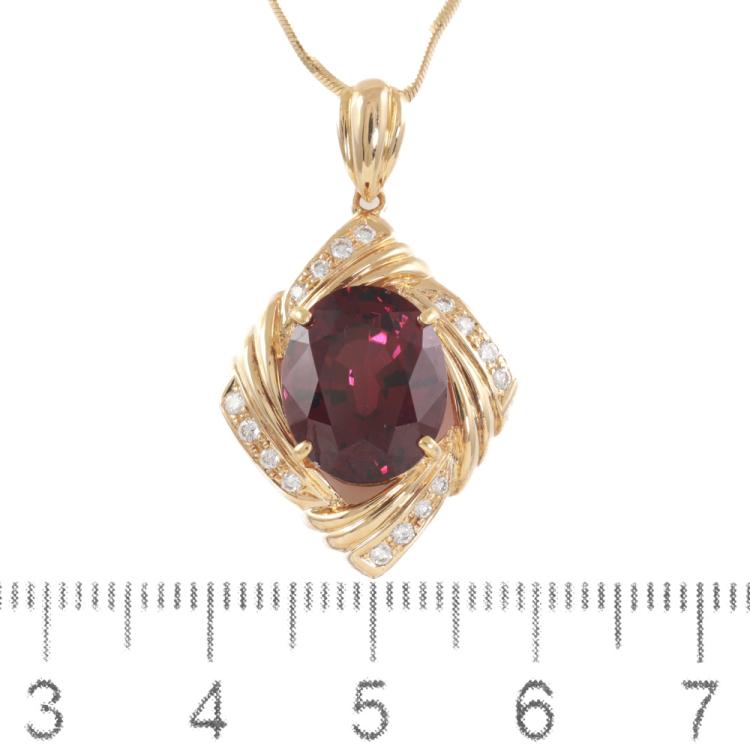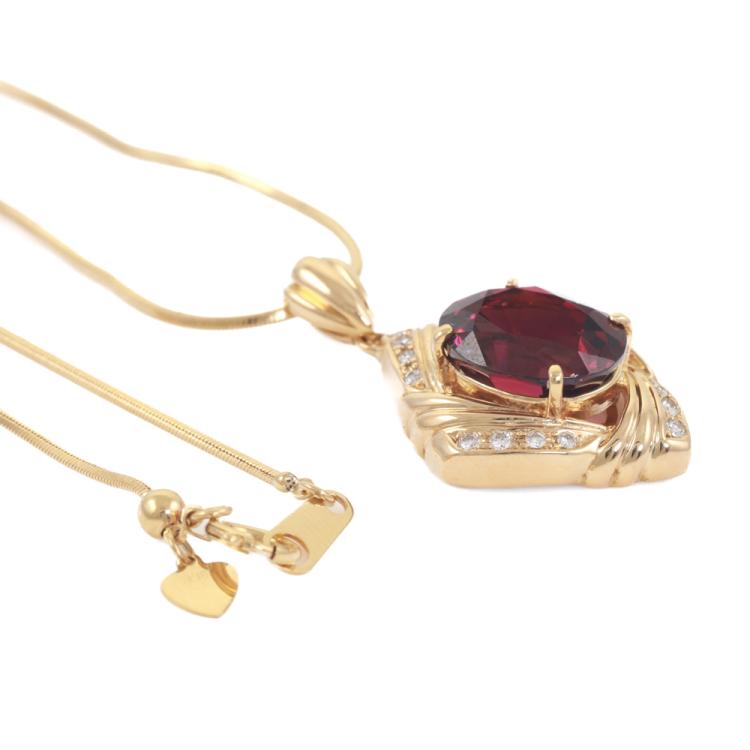 Tourmaline and Diamond pendant with an oval Natural Rubellite Tourmaline of 6.84ct and round Natural Diamonds totalling 0.15ct. 18ct yellow gold with 45cm 18ct yellow gold adjustable chain. Weight: 10.3g. (Pre-owned)