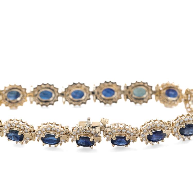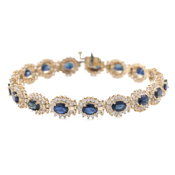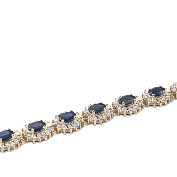 Sapphire and Diamond bracelet with 17 oval Natural Blue Sapphires totalling approximately 7.00ct (size of Sapphire 6x4mm) and round Natural Diamonds totalling approximately 2.20ct (Estimated grading: I-J SI). 14ct yellow gold. Length: 18cm. Weight: 17.4g. With Certificate #419508. (Pre-owned)
