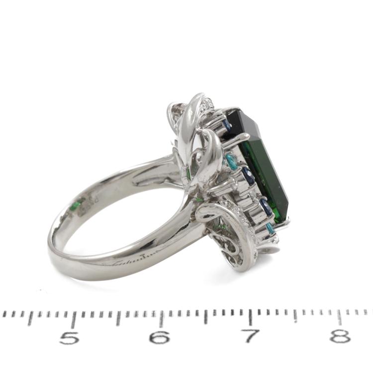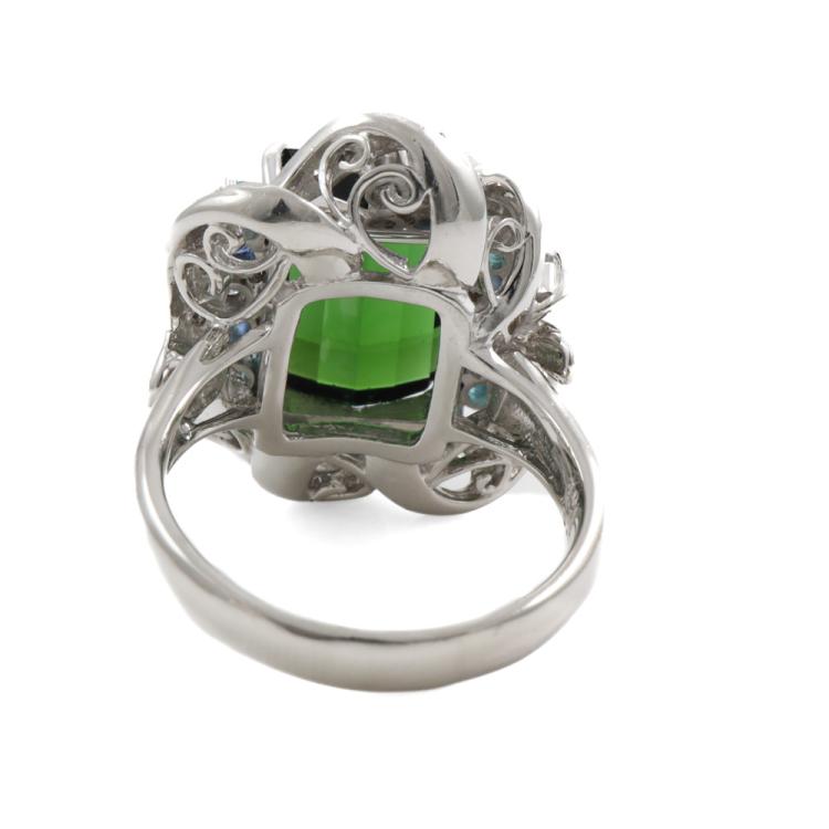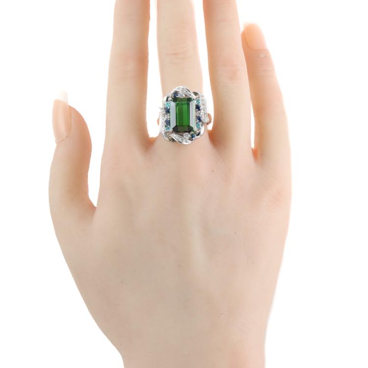Tourmaline, Paraiba, Sapphire and Diamond ring with emerald cut green Natural Tourmalines of 7.06ct, round Natural Paraiba Tourmalines of 0.16ct, round blue Natural Sapphires 0.42ct and round Natural Diamonds totalling 0.45ct (Estimated grading: H & J SI). Platinum - 900. Ring size: O1/2. Band Width: 3.3mm - 4.0mm. Weight: 16.6g. (Pre-owned)