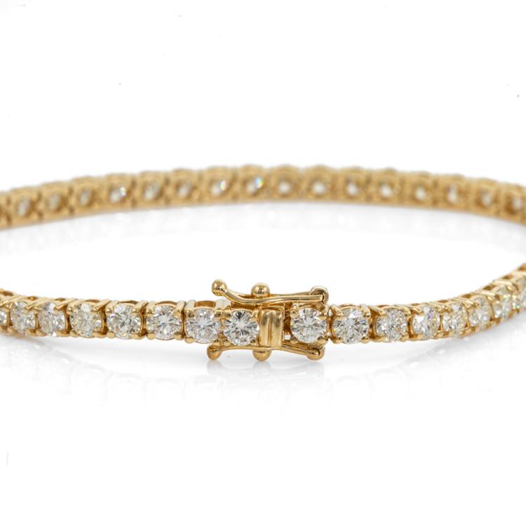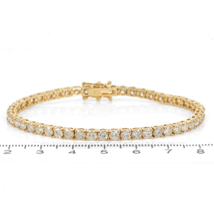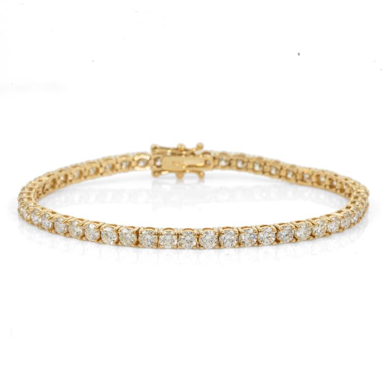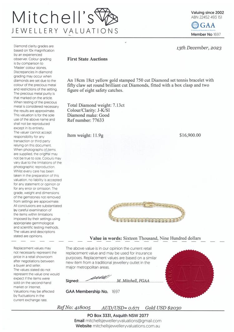 Diamond tennis bracelet with 50 round brilliant cut Natural Diamonds totalling 7.13ct. (Estimated grading: J-K SI) 18ct yellow gold. Length: 18cm. Weight: 11.9g. With Valuation Certificate #418006. (New)