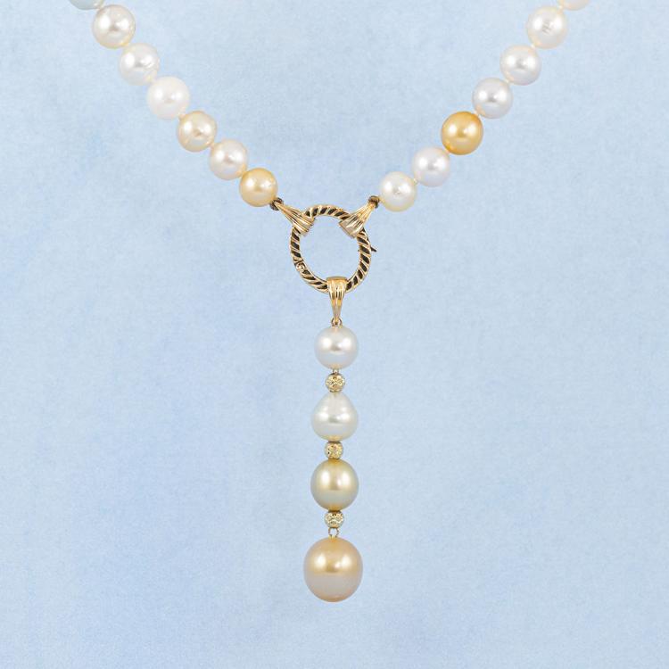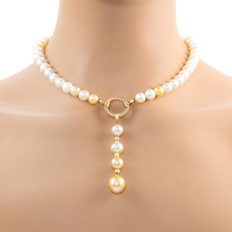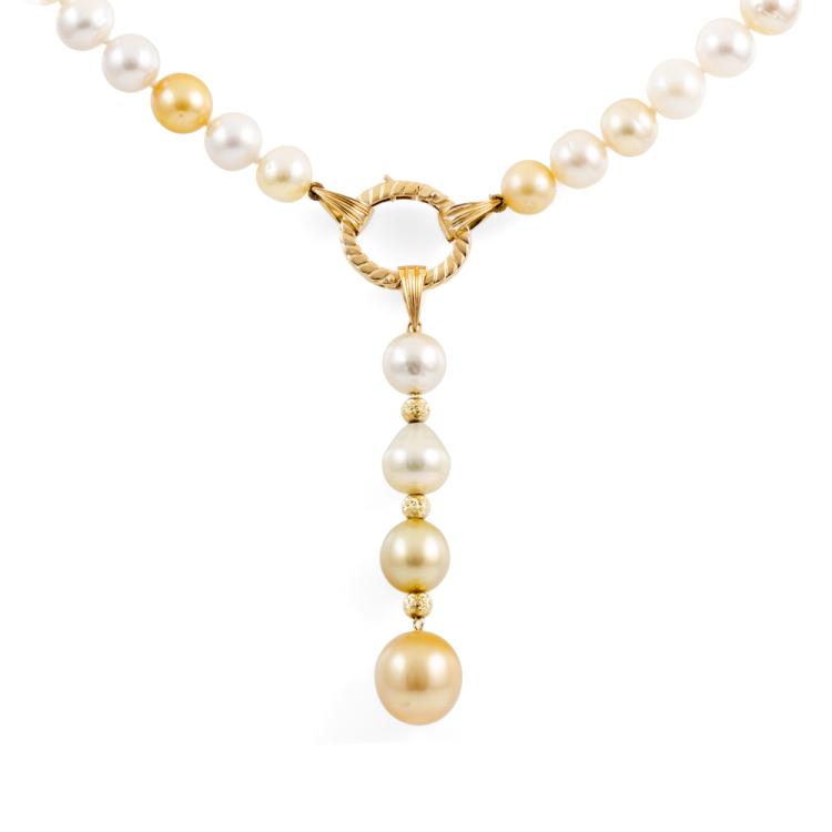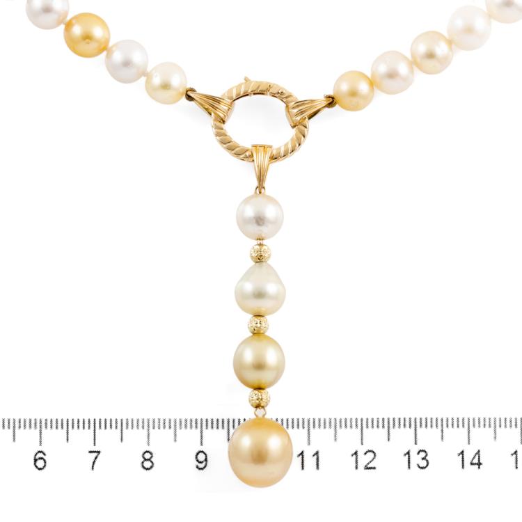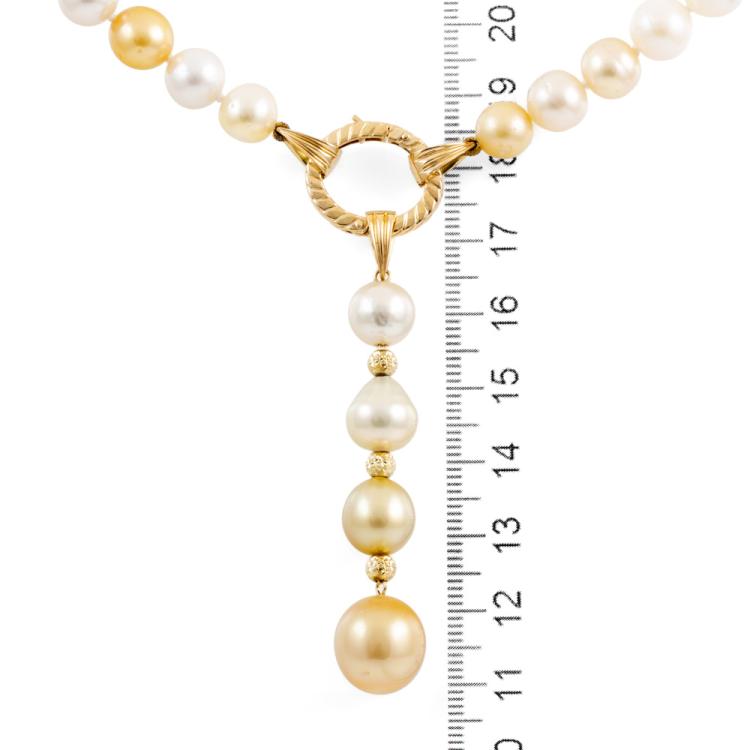 Pearl detachable necklace with white, golden & creamed South Sea Pearls of 7.7mm - 12mm. 18ct yellow gold clasp. Length: 62.5cm. Weight: 85.3g. (Pre-owned).