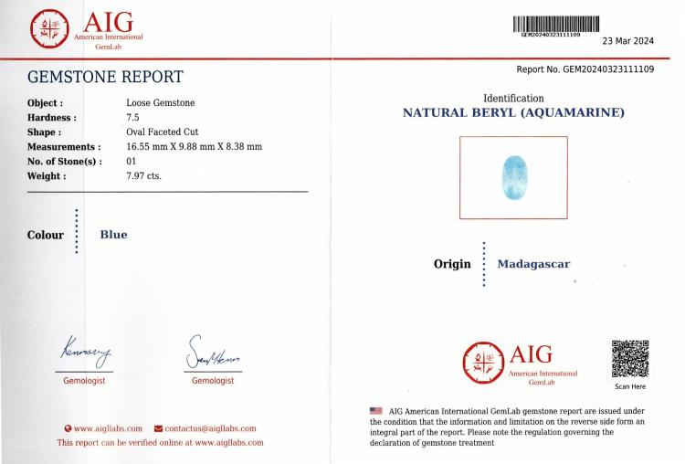 A Loose oval shape natural Madagascan Aquamarine of 7.97ct (with AIG Gemstones Report # GEM20240323111109). (As new)