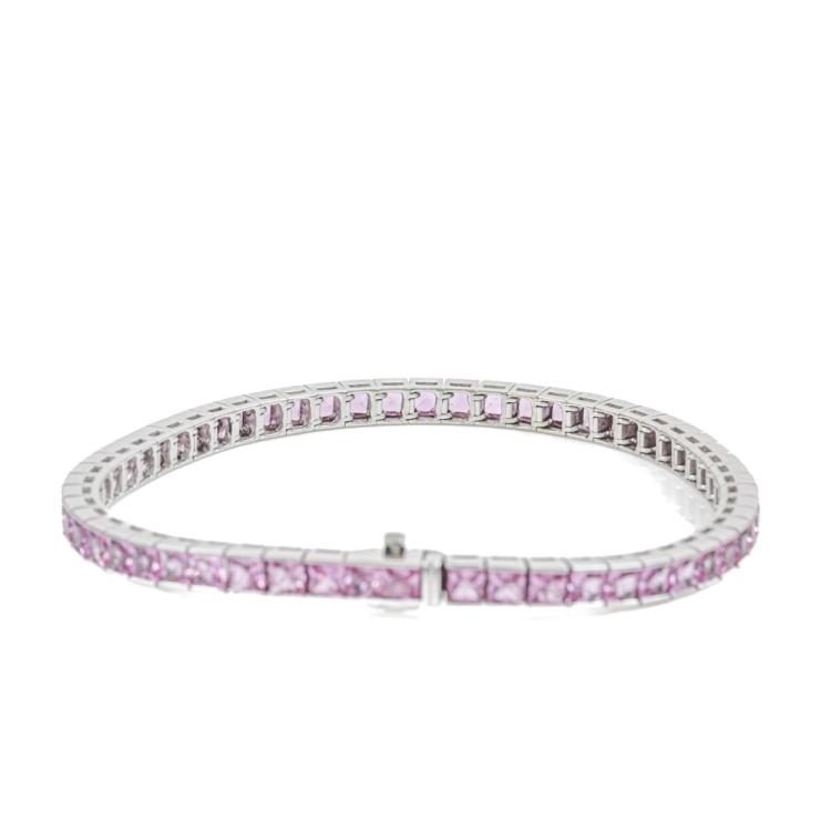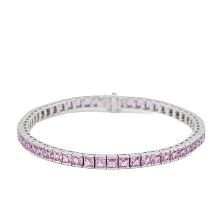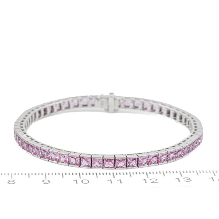 Sapphire Bracelet with 56 princess cut pink Natural Sapphires totalling approximately 8.00ct. 18ct white gold. Length: 17cm. Weight: 17.5g. With Certificate. (Pre-owned)