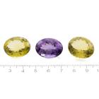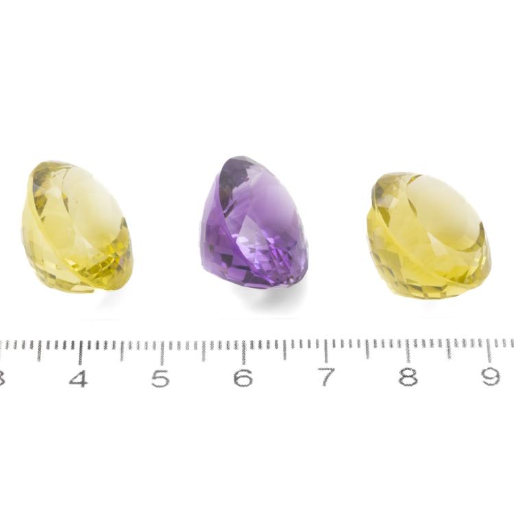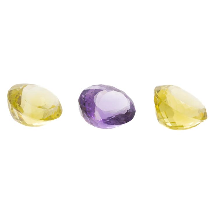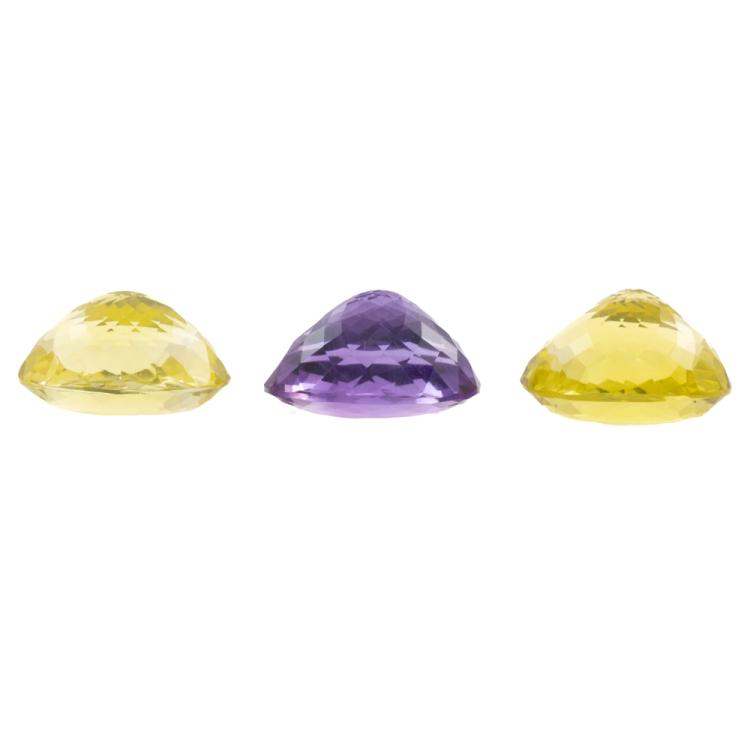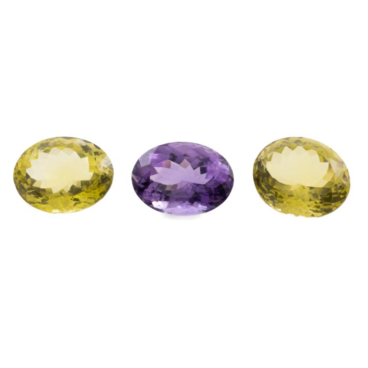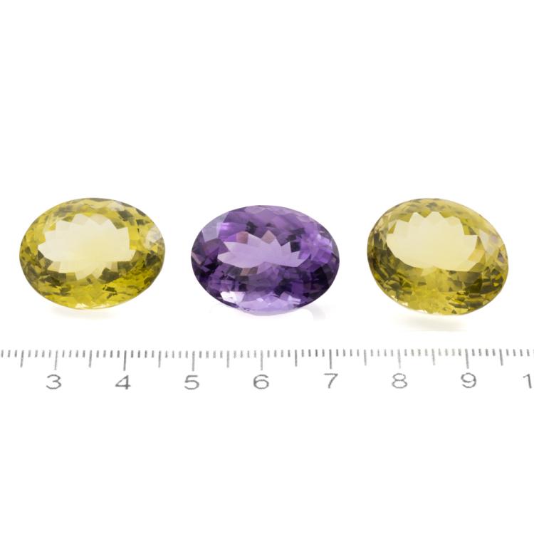 A parcel of 3 Loose mixed Quartz with 1 oval shape Natural Amethyst of 24.96ct of size approximately 22.2mm x 16.3mm x 12.3mm and 2 oval shape Natural Lemon Quartz totalling 55.99ct of size approximately 21.7mm x 18.0mm x 12.8mm and 22.1mm x 17.1mm x 11.7mm. (New)