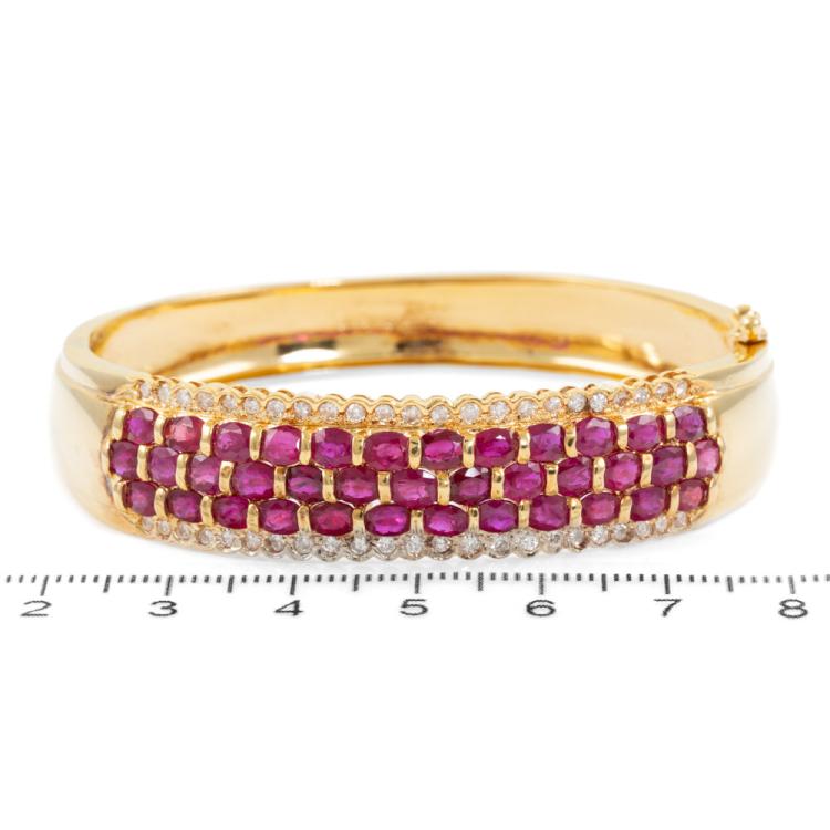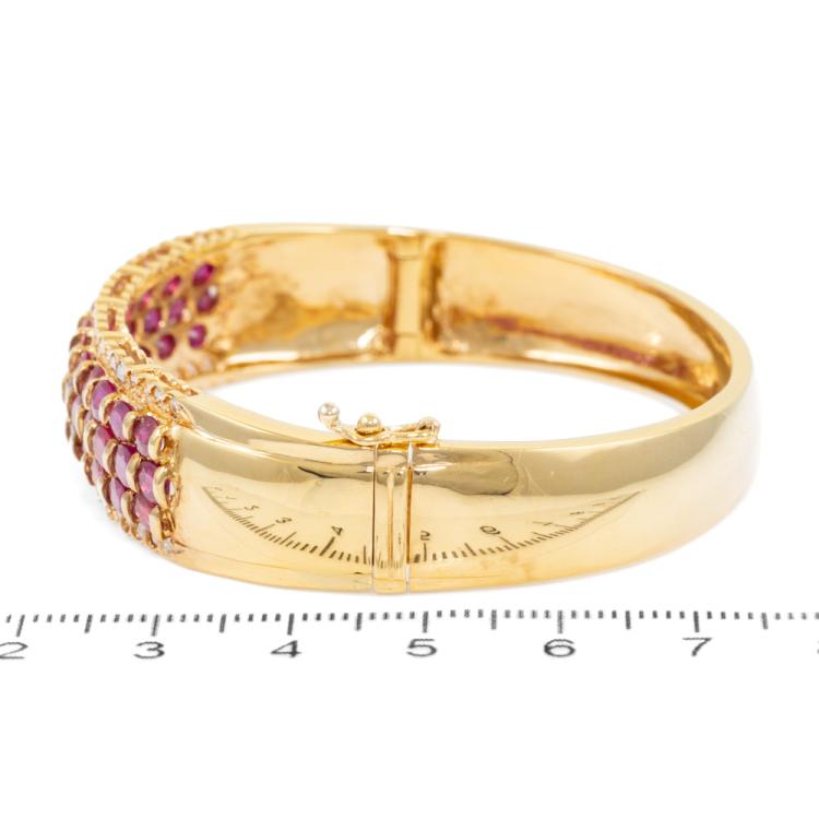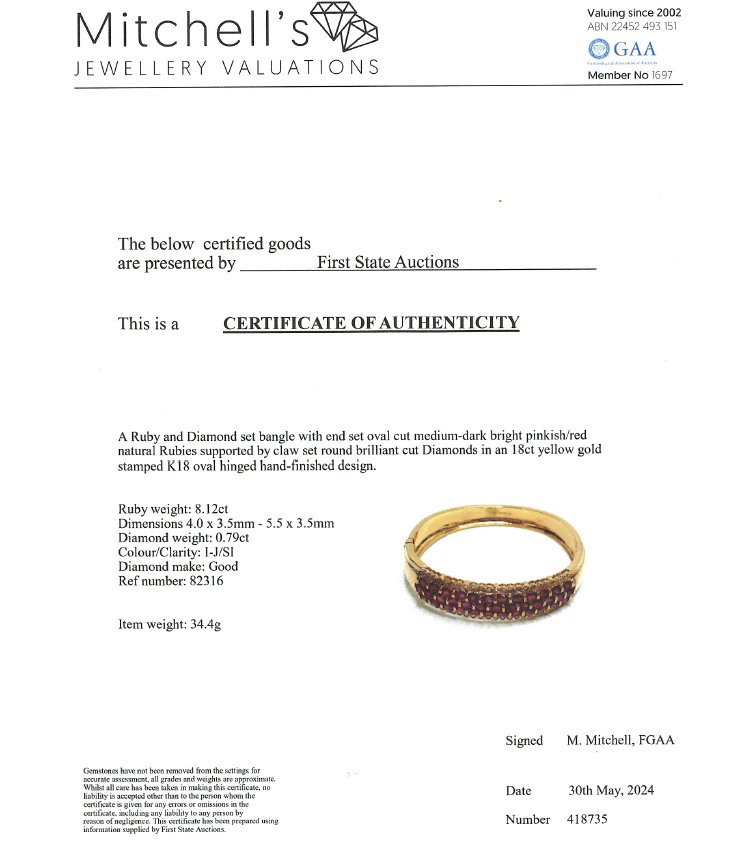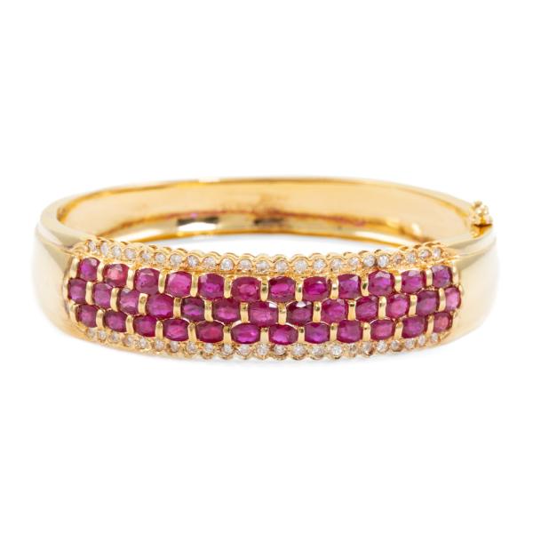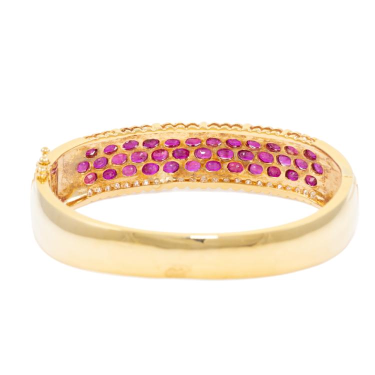 Ruby and Diamond bangle with oval shape natural Rubies totalling 8.12ct and round natural Diamonds totalling 0.79ct (Estimated grading: I-J SI). 18ct yellow gold. Circumference: 15.5cm. Width: 8.8mm-13.5mm. Weight: 34.4g. With Certificate #418735. (Pre-owned)