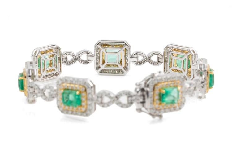 Emerald and Diamond bracelet with Natural Emerald totalling 8.47ct and Natural Diamonds totalling 4.82ct (Estimated grading: G SI). 18ct yellow gold and white gold. Length: 18.5cm. Weight: 30.8g. With Valuation Certificate #417809. (Pre-owned)