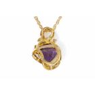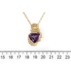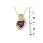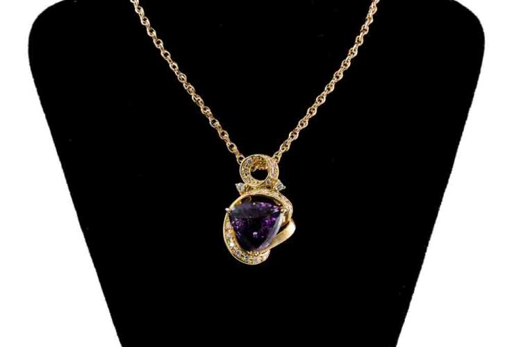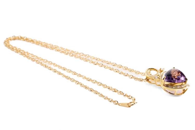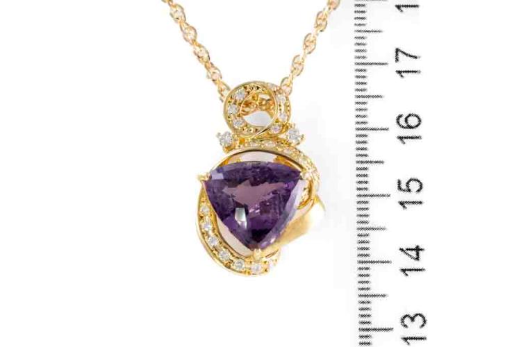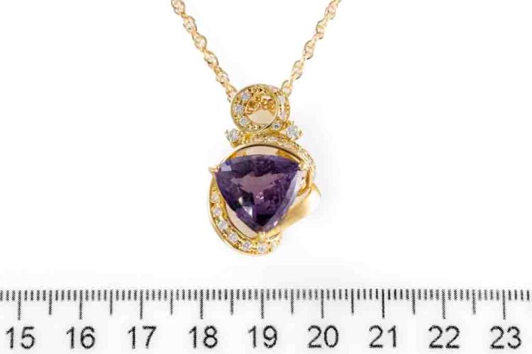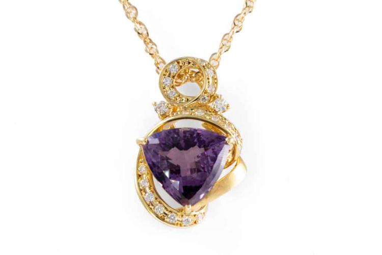 Amethyst and Diamond pendant with a trilliant cut Natural Amethyst of 9.00ct and round Natural Diamonds totalling 0.39ct (Estimated grading: H SI). 18ct yellow gold with 45cm 18ct yellow gold chain. Weight: 10.2g. (Pre-owned)