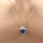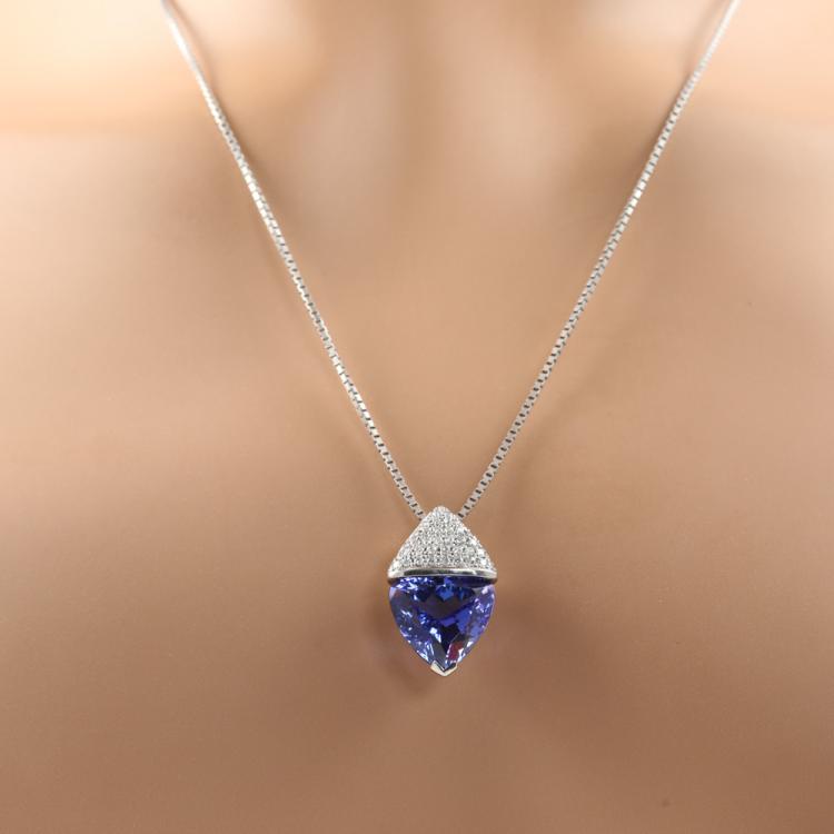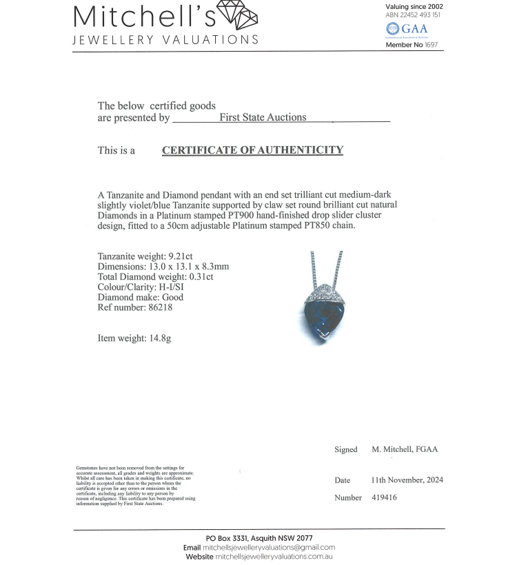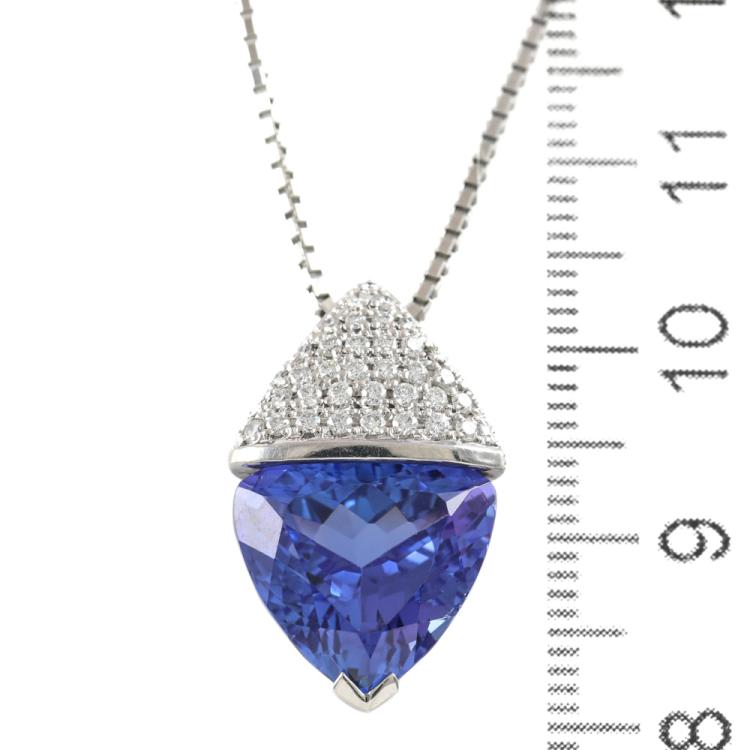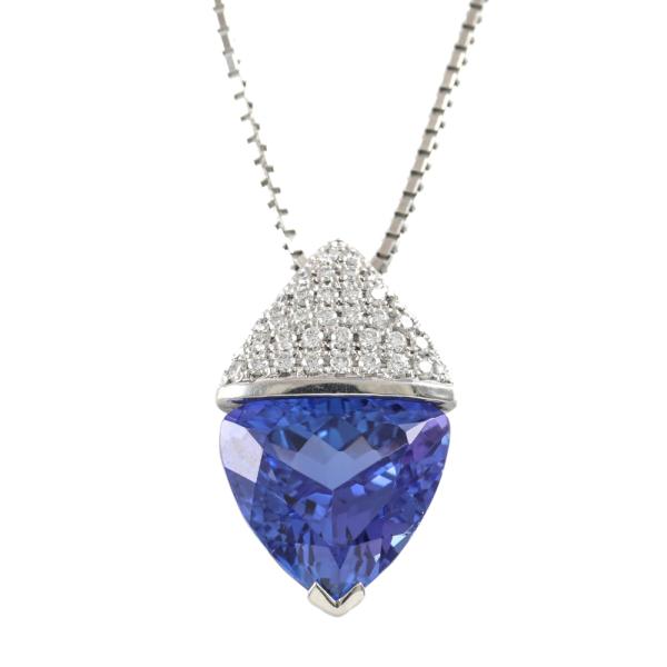 Tanzanite and Diamond pendant with trilliant cut Natural Tanzanite of 9.21ct and round Natural Diamonds totalling 0.31ct (Estimated grading: H-I SI). Platinum - 900 with 50cm Platinum-850 adjustable chain. Weight: 14.8g. With Certificate #419416. (Pre-owned)
