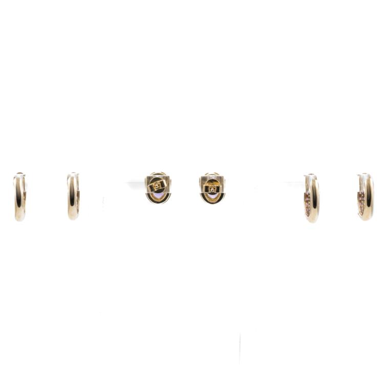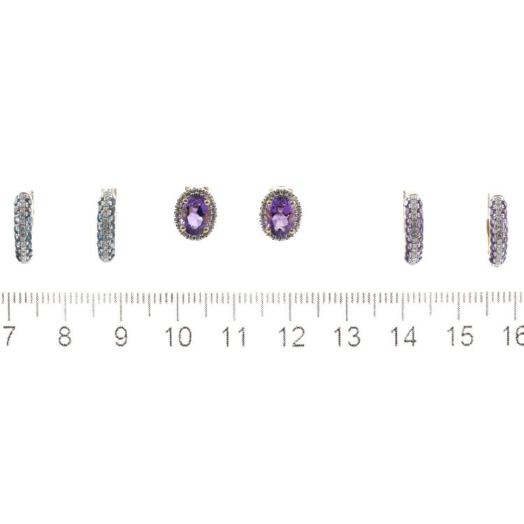 Three piece Amethyst and blue Topaz set: incl. 1) Amethyst stud earrings with oval shape Natural Amethyst of approx. 1.50ct (7.0mm x 5.0mm) & Natural Diamonds totalling 0.10ct. 2) Amethyst hoop earrings with Natural Amethyst totalling approx. 0.24ct (1.5mm) & Natural diamonds of 0.10ct. 3) Topaz hoop earrings with Natural blue Topaz of approx. 0.32ct (1.5mm) & diamonds totalling 0.10ct. All 9ct yellow and white gold. Combined weight: 5.8g (As new)